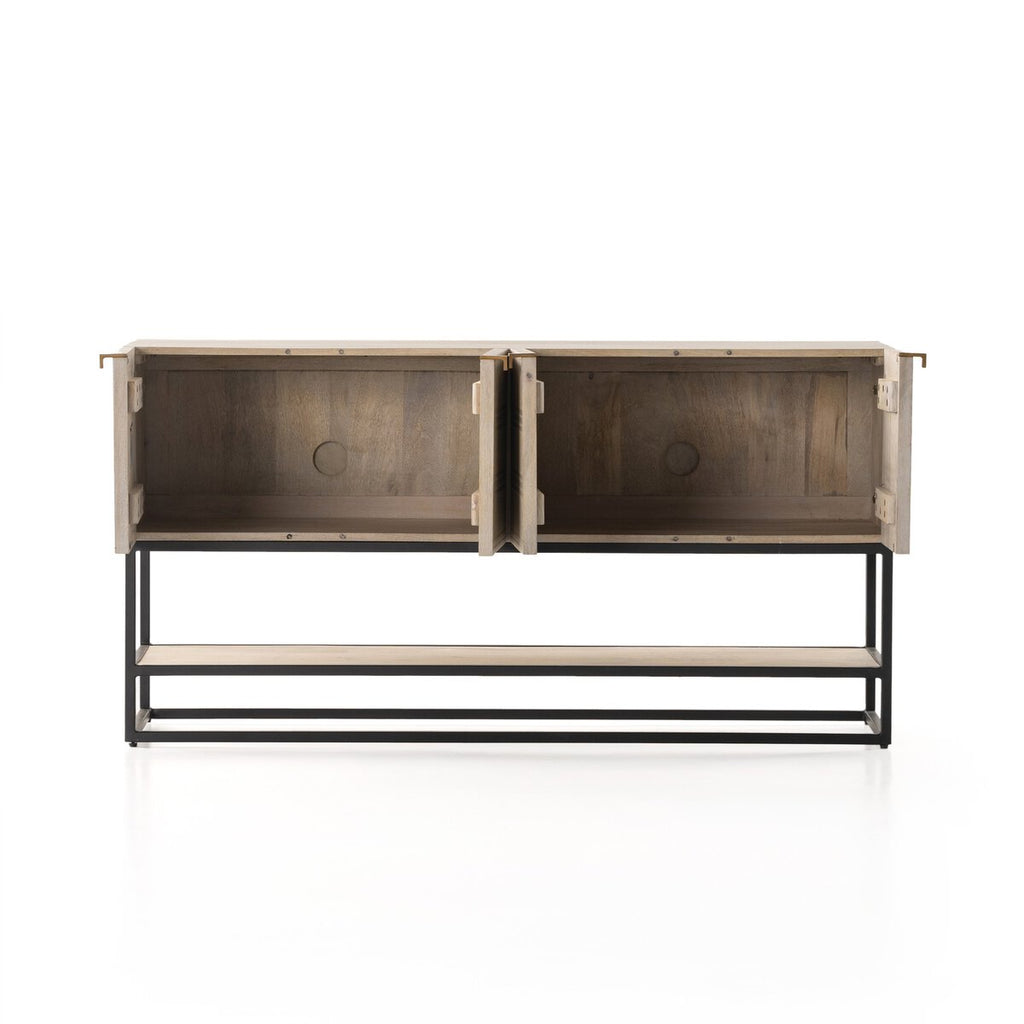 Mango wood's unique linear carving highlights texture and true artisanship. A slim gunmetal base adds an airy, cage-like look to small-scale media storage. Rear cutouts for cord management.