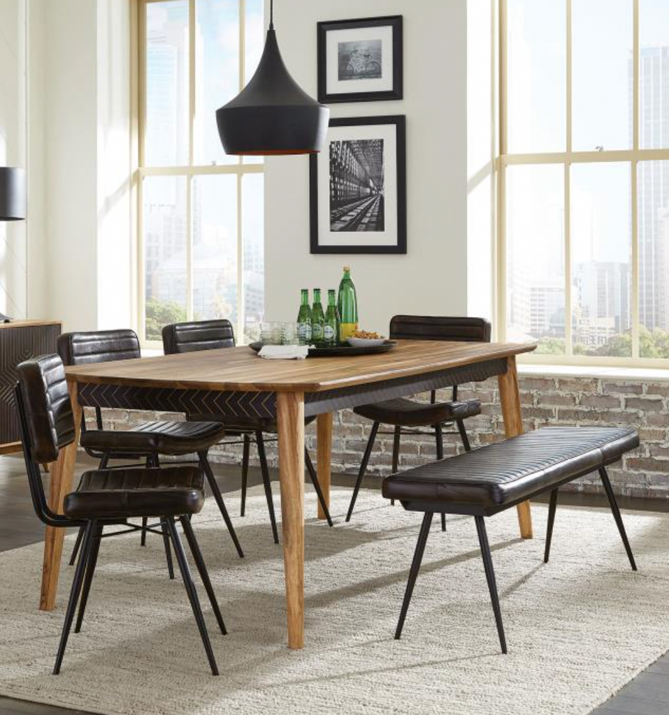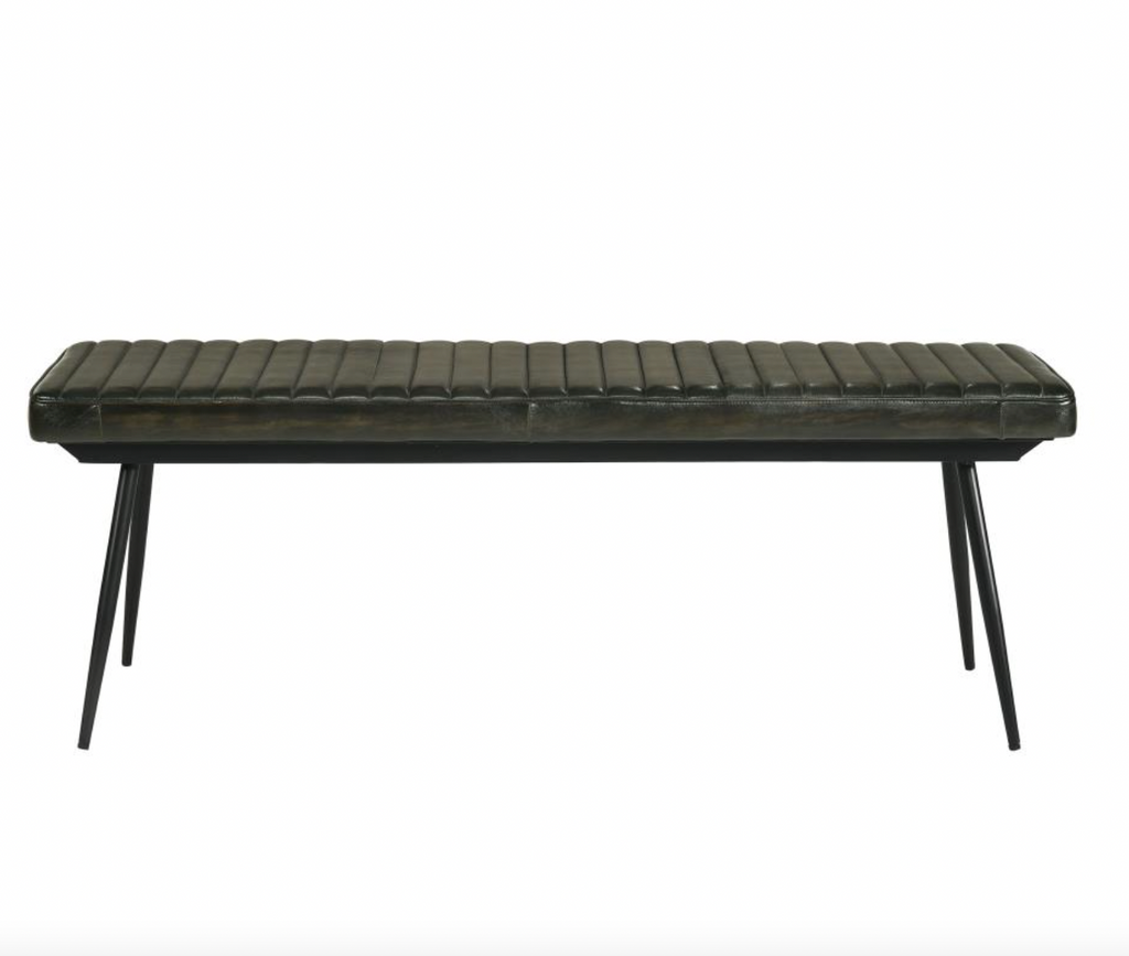 Upholstered in hand-dyed genuine goat leather, the padded seat with vertical tufting offers both comfort and durability. The sleek black metal base, featuring flared and tapered legs, provides a sturdy foundation with a modern edge.