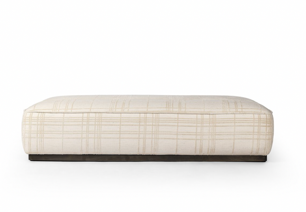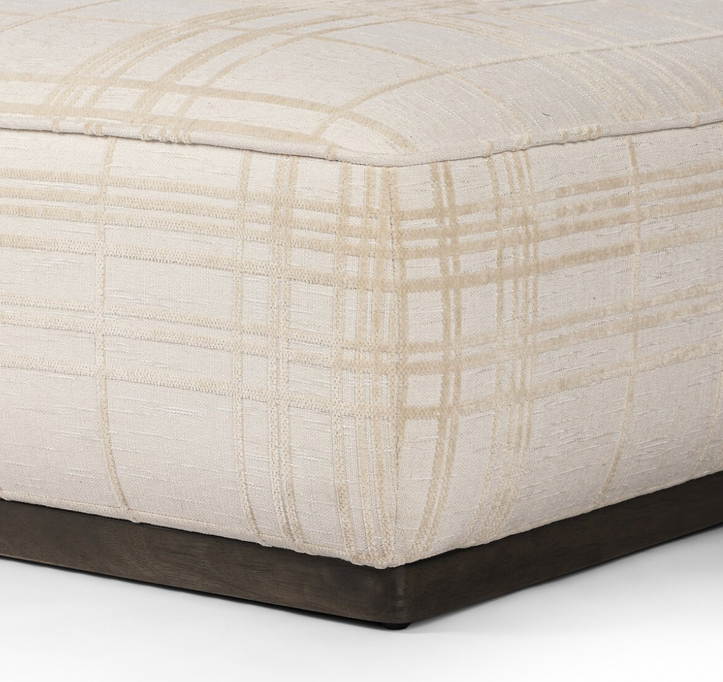 Upholstered in traditional ivory fabric with a classic box print with a sienna brown wood base, this large, rectangular ottoman suits a variety of spaces. Style with a tray as a design-forward coffee table.