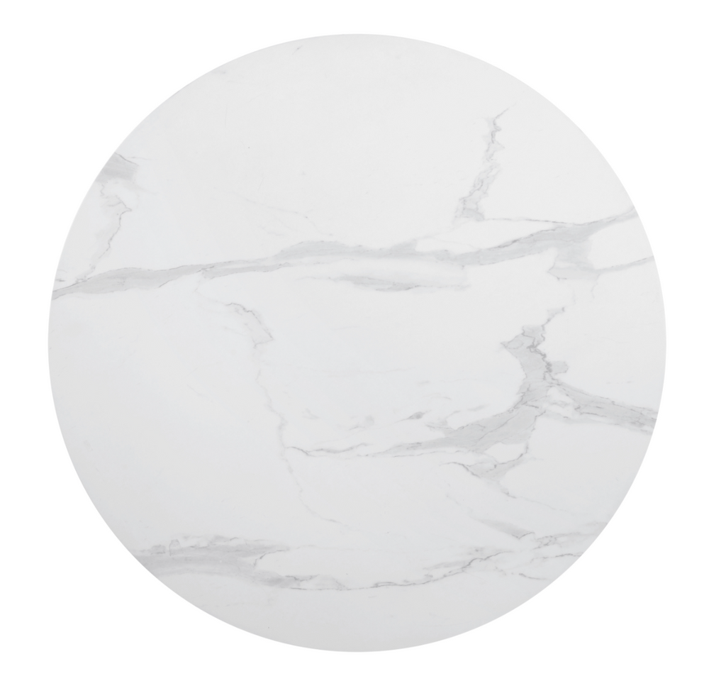 Tulip-shaped dining table with a faux white marble top and metal base. Elegant and practical.