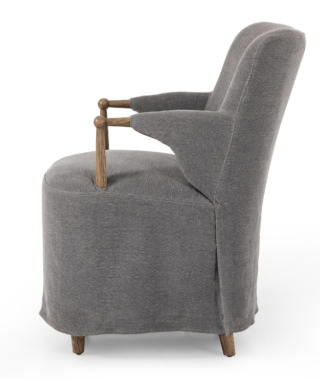 A polished take on the classic dining chair form. A fixed slipcover in a flax/linen blend integrates seamlessly into distressed oak arms and drapes into a skirt at the base. A comfortable S-spring seat design invites you to settle in. A design collaboration by Amber Lewis and Four Hands. This item has limited online distribution and may not be sold on websites without prior approval. Visit the FAQ page in our Help Center for more details.
