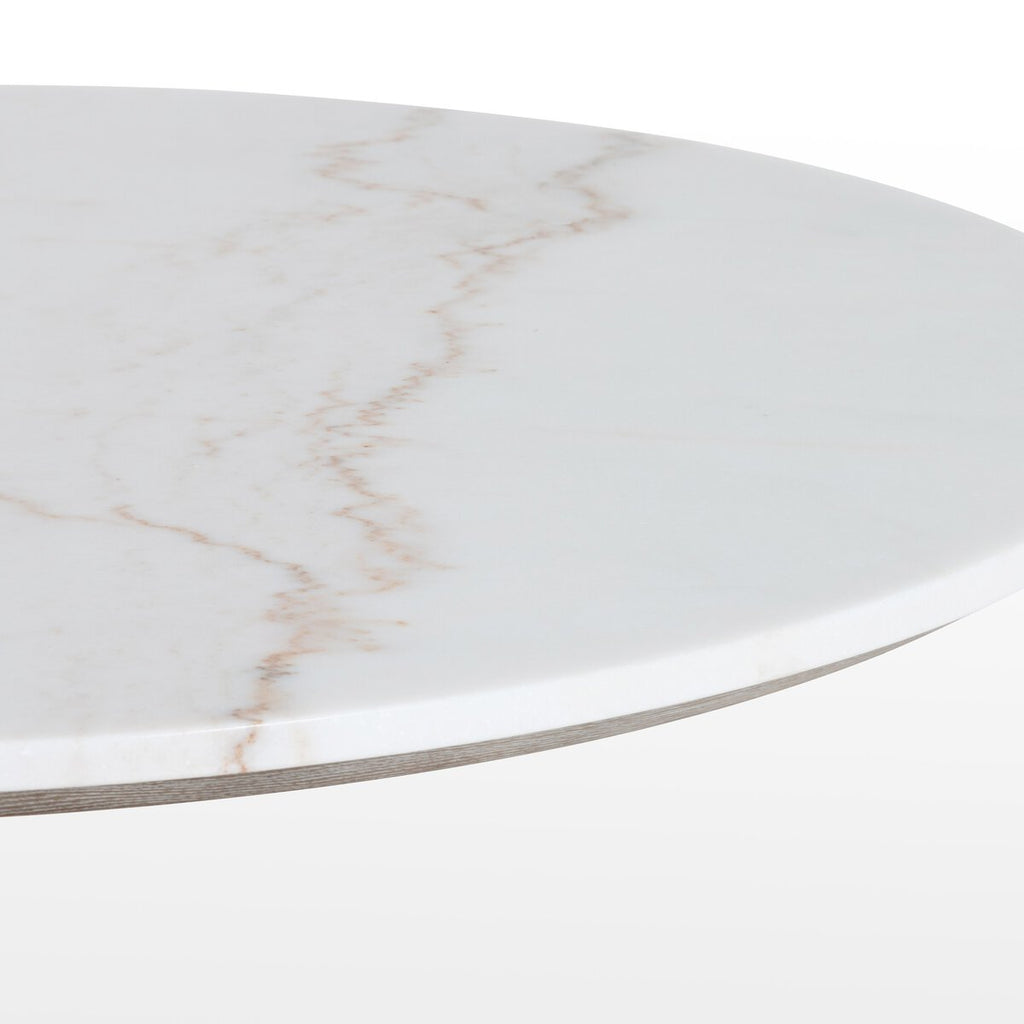 Mixed materials make the table. Classic tulip shaping is recast with a rustic black iron base and rounded top of white marble. Bistro style perfectly sized for a cozy breakfast nook.