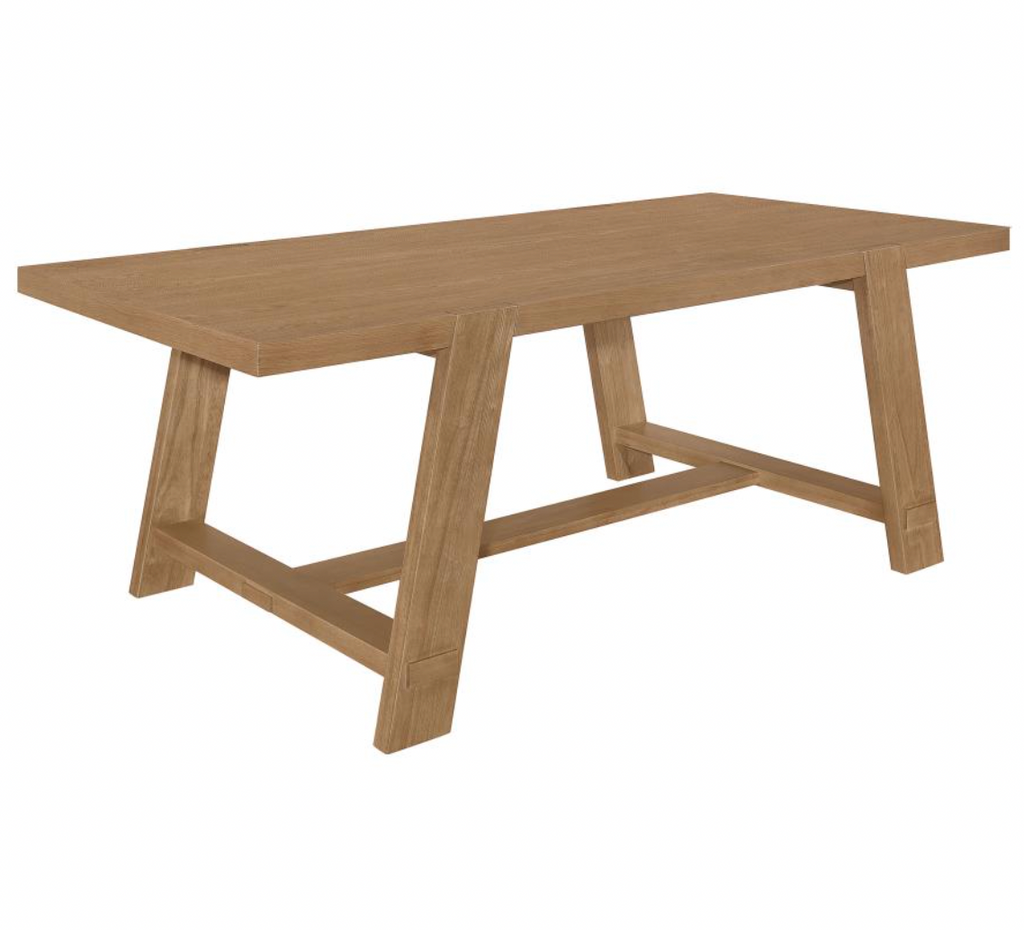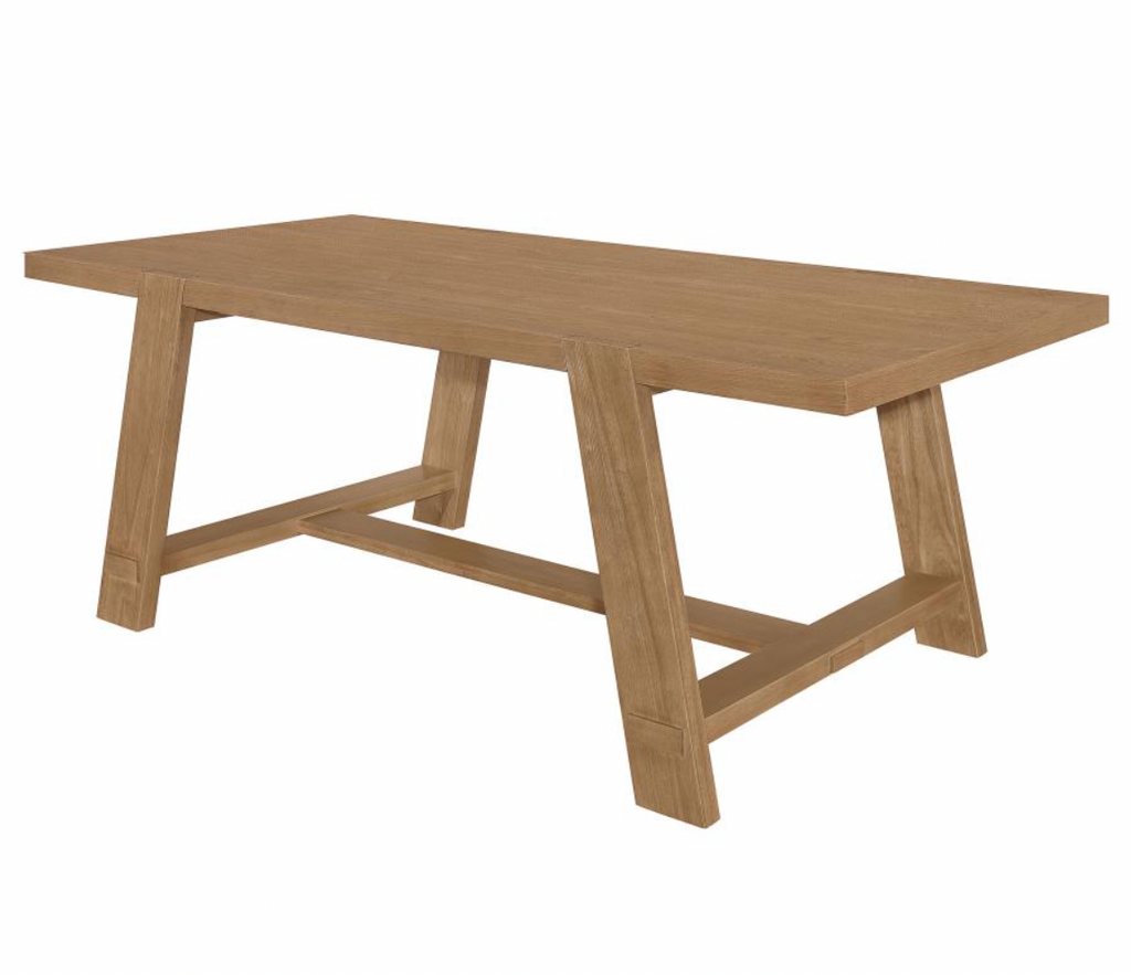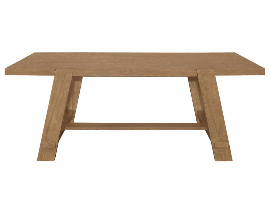 Elevate your dining room with the captivating blend of modern farmhouse style in this stunning dining table. The brown wire-brushed finish highlights the natural beauty of the wood, adding warmth and character. The open, airy U-shaped legs and wide trestle base infuse a distinct modern touch