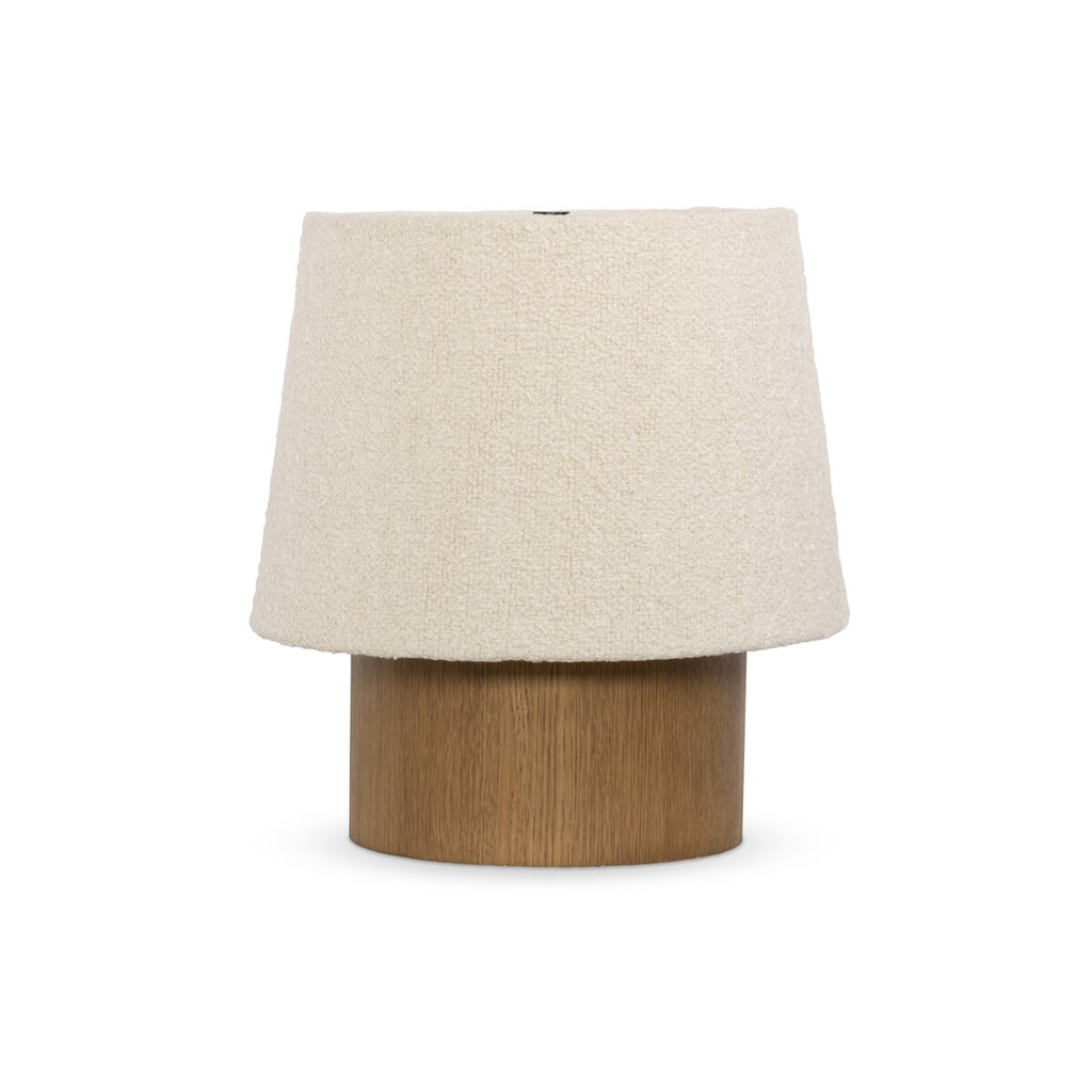 Dramatic proportions and soft texture define this unique table lamp. Light, smoked oak shapes a cylinder base for an overscaled boucle shade, bringing a playful, monochromatic look to any space.