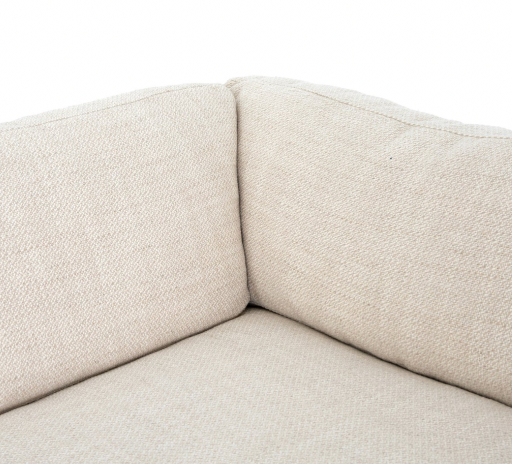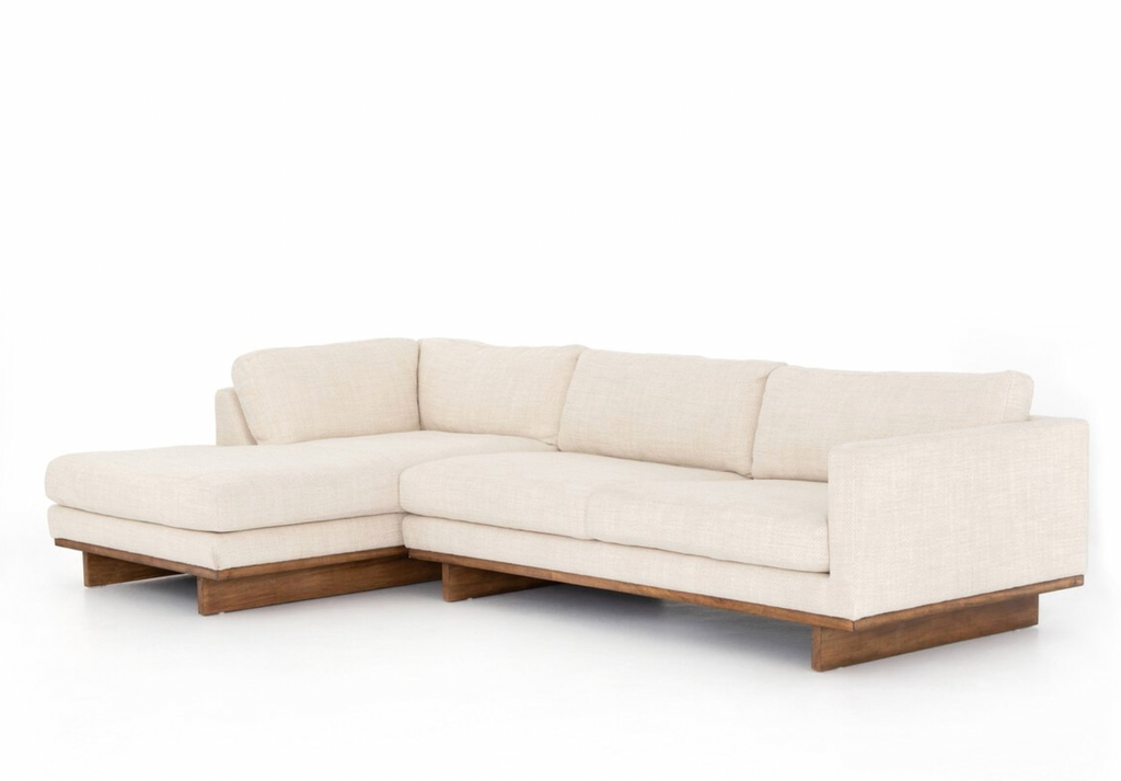 Classic goes contemporary. A cocoa-finished parawood base supports low, deep seating of performance-grade upholstery in an invitingly neutral taupe, with track arms for a clean touch. Left arm facing two-piece sectional.