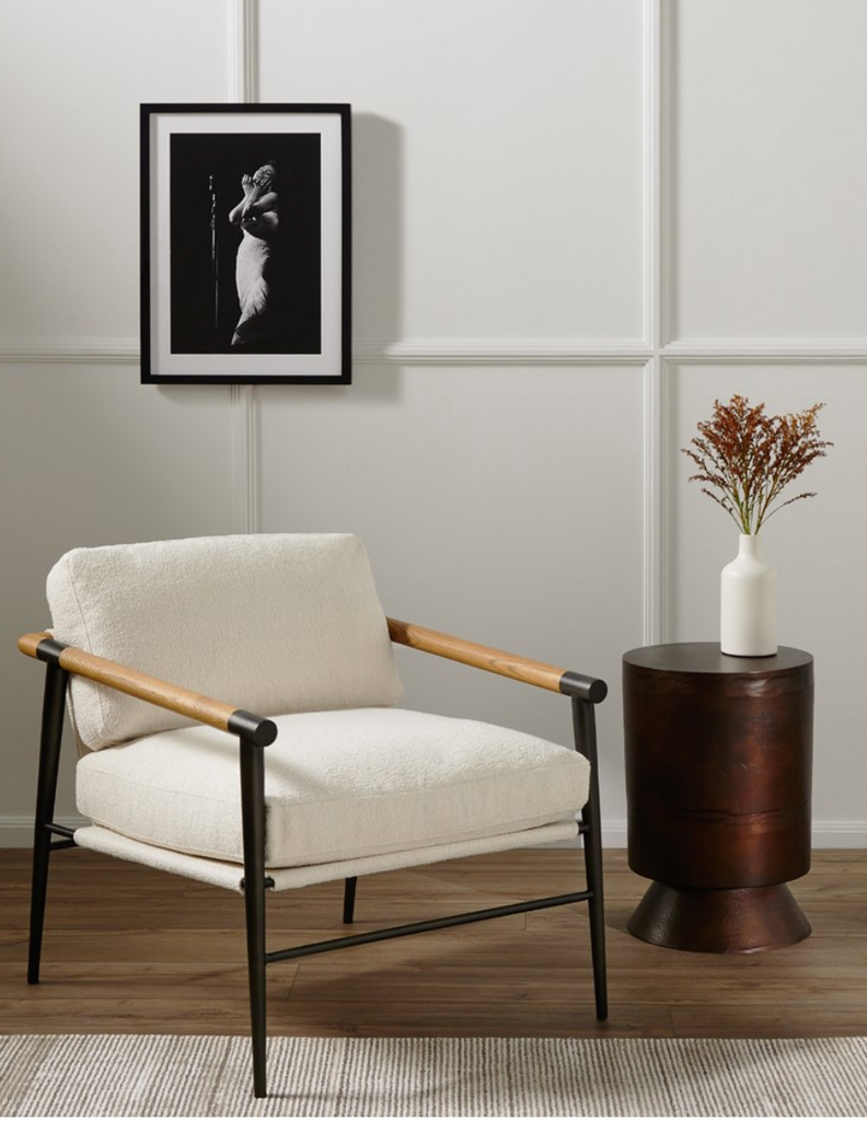 Textural seating in Fayette Cloud upholstery, with angular arms of exposed oak providing fresh contrast. Slim, carbon-finished steel legs for a dose of modern-industrial edge.