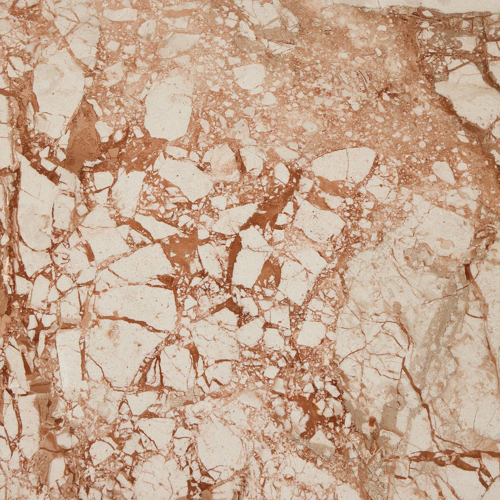 Solid marble sheets are laminated to create cubed cradle bases for a thick-cut tabletop. Heavy veining and natural swirls speak to the nature of marble, with each piece being entirely unique.
