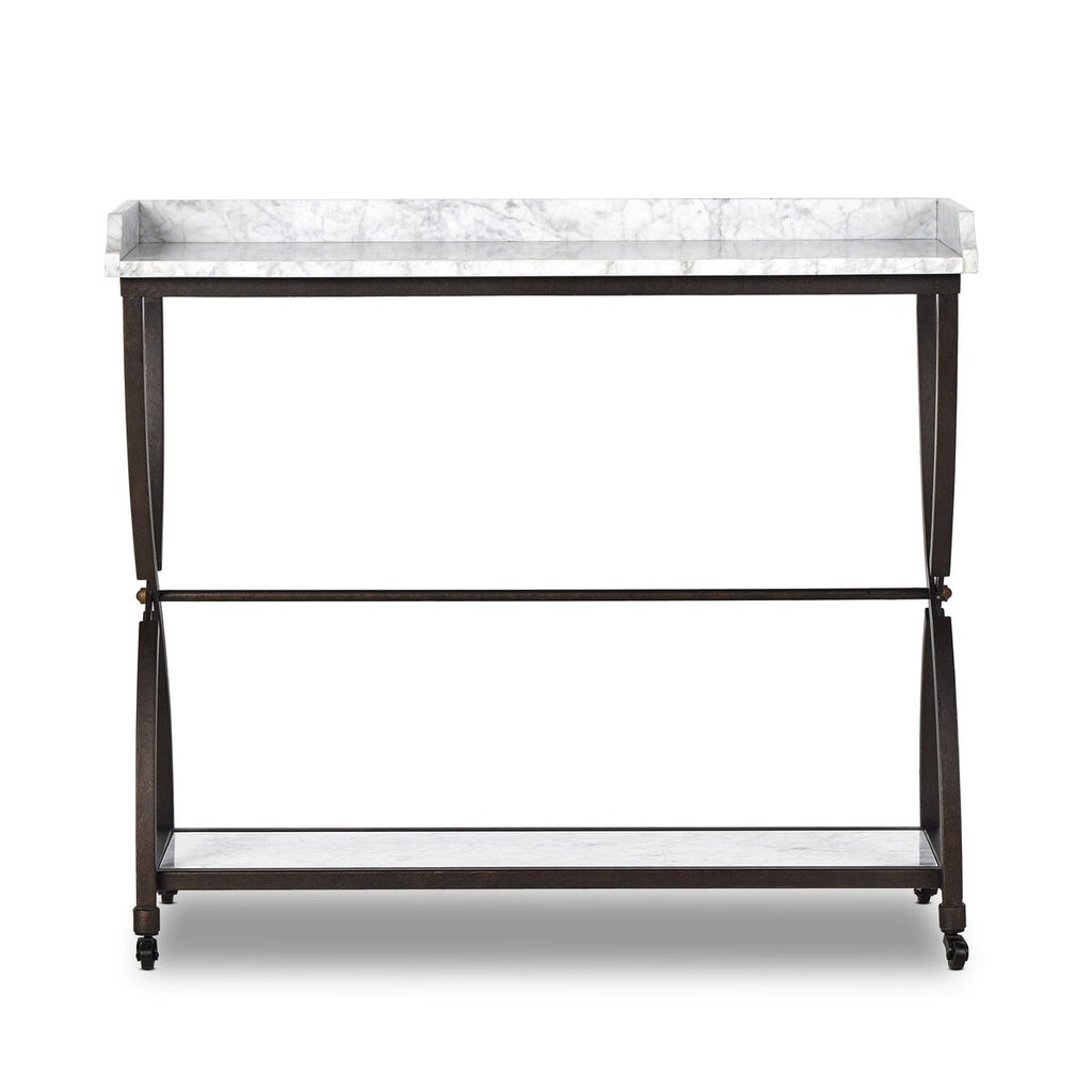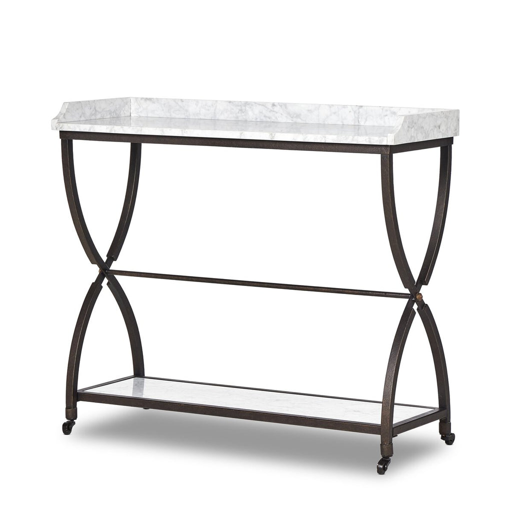 By the makers at Van Thiel, known for their antique-inspired pieces and hand-applied finishes. Textured bronze iron forms an elegant, airy frame for solid white marble shelves. Decorative casters add a fun finishing touch.