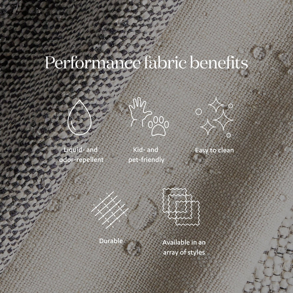 Textural and curve driven. Inspired by Japanese Tatamis, a cleverly constructed outer frame consists of rattan and natural cane paneling. For a clean, monochromatic look sits cream linen-blend performance seating, with knife-edge pillows for extra comfort. Performance fabrics are specially created to withstand spills, stains, high traffic and wear, ensuring long-term comfort and unmatched durability.