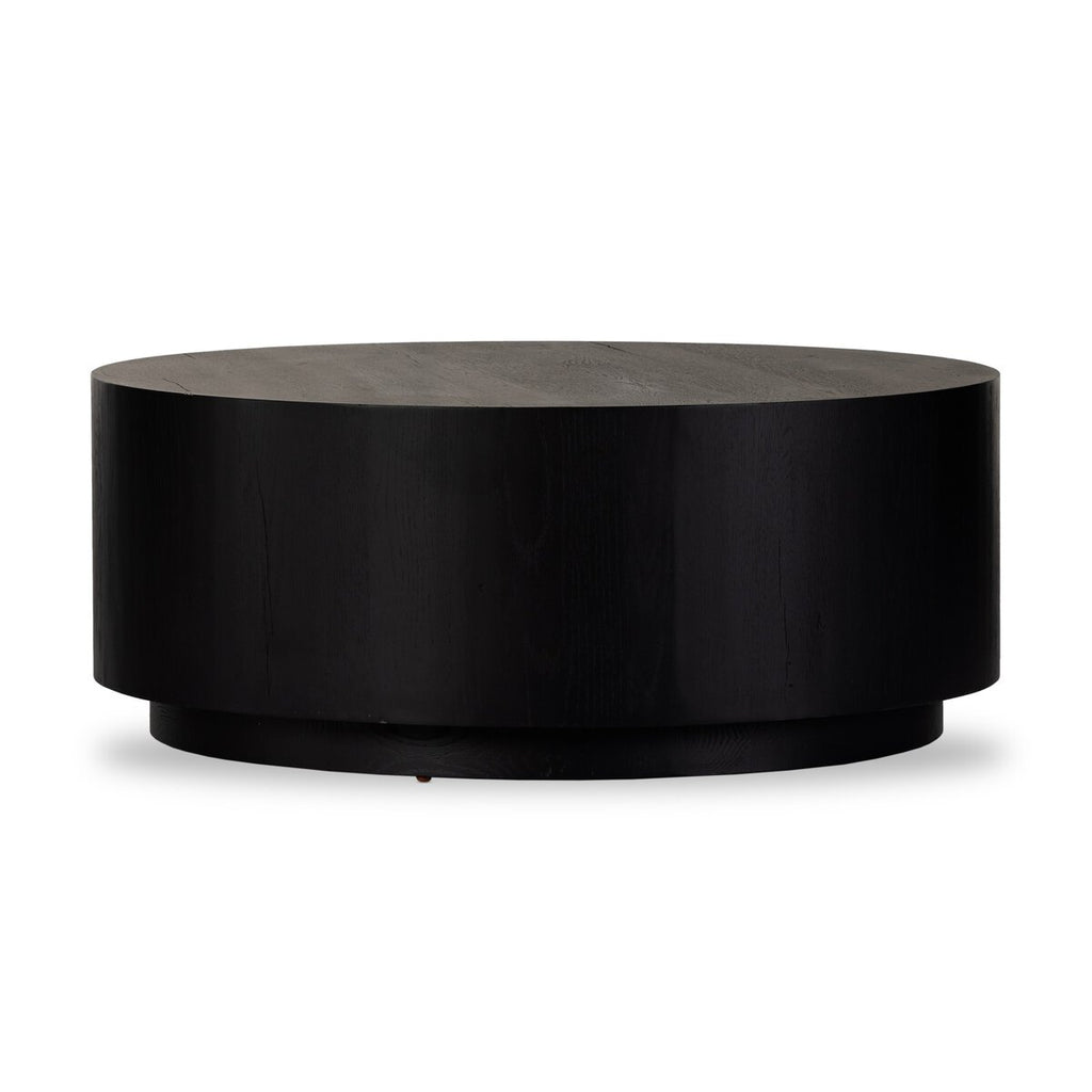A rounded coffee table of coal-finished solid oak and oak veneer tops a plinth base, for a simple yet timeless look.