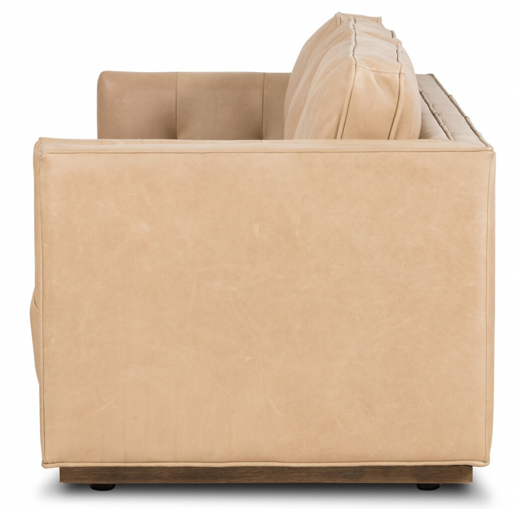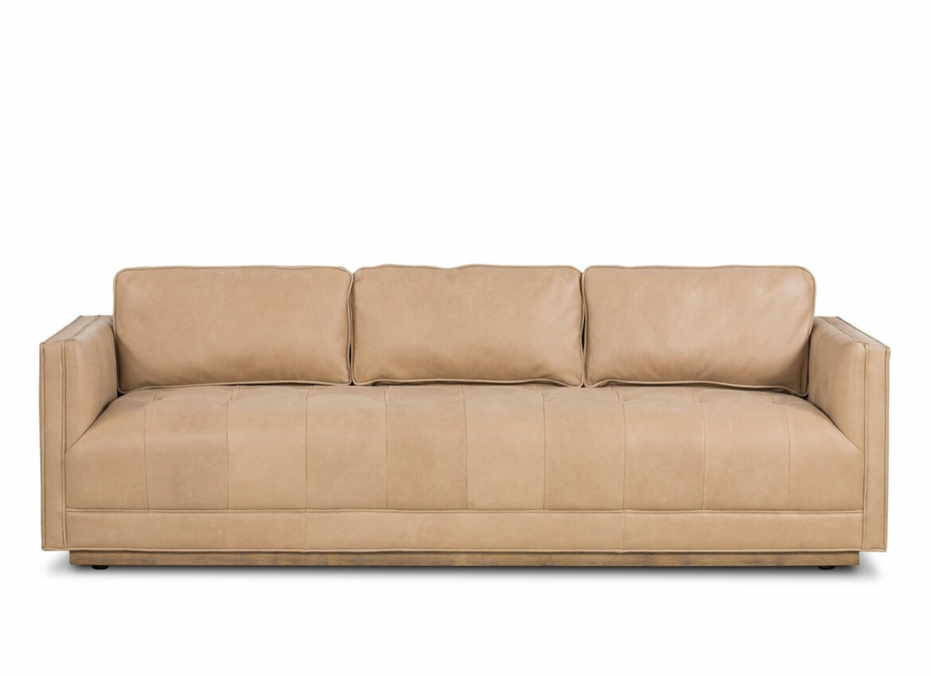 A subtle plinth parawood base supports nude top-grain leather seating, spurring the perfect fusion of comfort and sophistication with button-tufted seating and armrests.