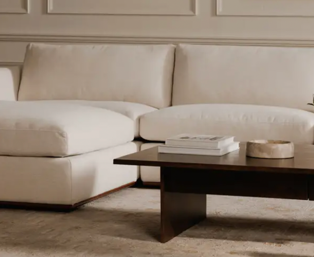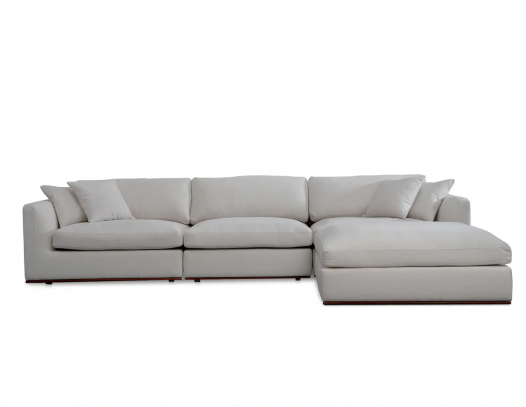 The Rue modular sectional features a generous 70% feather-fill topper within its seating, accompanied by toss cushions for an added layer of coziness. Its elegant silhouette is highlighted by a rubber wood base, creating a sleek floating appearance, all supported by subtle wooden legs. Designed with extreme comfort in mind, this modular embodies easy, neutral styling.