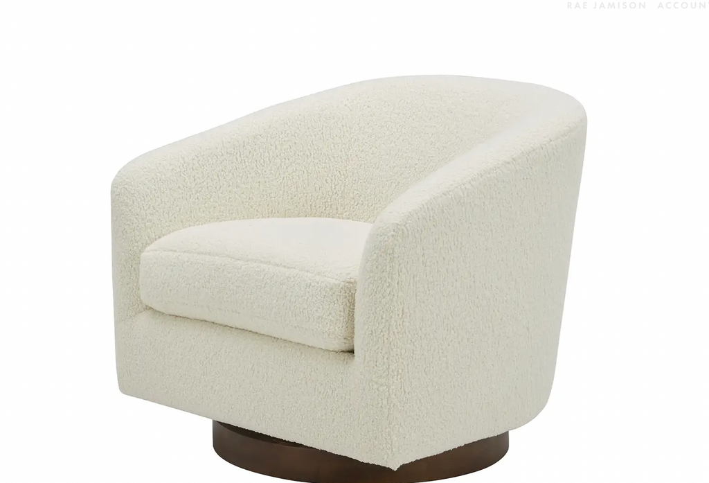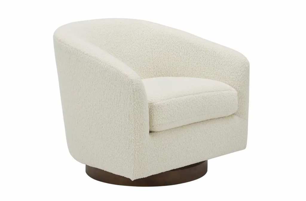 Light and cheerful. Calm and relaxed. The Zion swivel chair is a cloud of comfort that brings airy energy and convenience into your living room with its 360° swivel, floating base design. Idyllic for a reading nook or as an accent chair, the Zion creates a chic retreat with vegan shearling upholstery that looks fresh and feels cozy.
