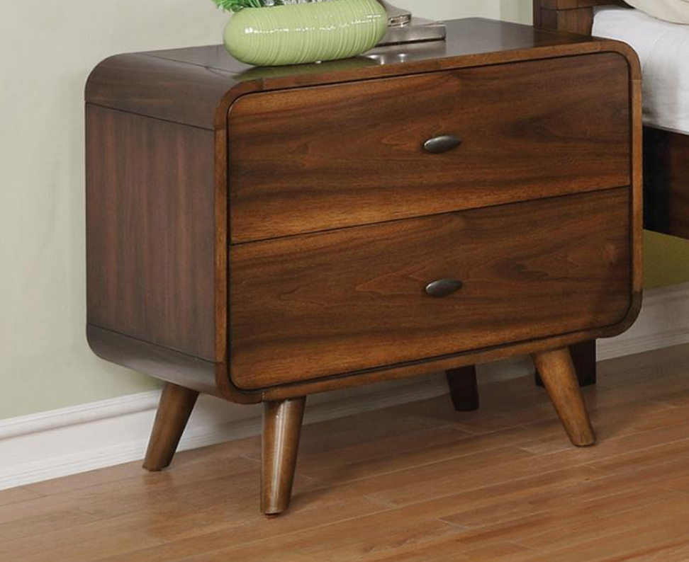 Mid-century modern style with rounded edges, dark walnut finish, and gunmetal hardware. The two-drawer nightstand features a felt-lined top drawer for keeping jewelry safe, and an additional drawer for keeping all your nighttime essentials close at hand.