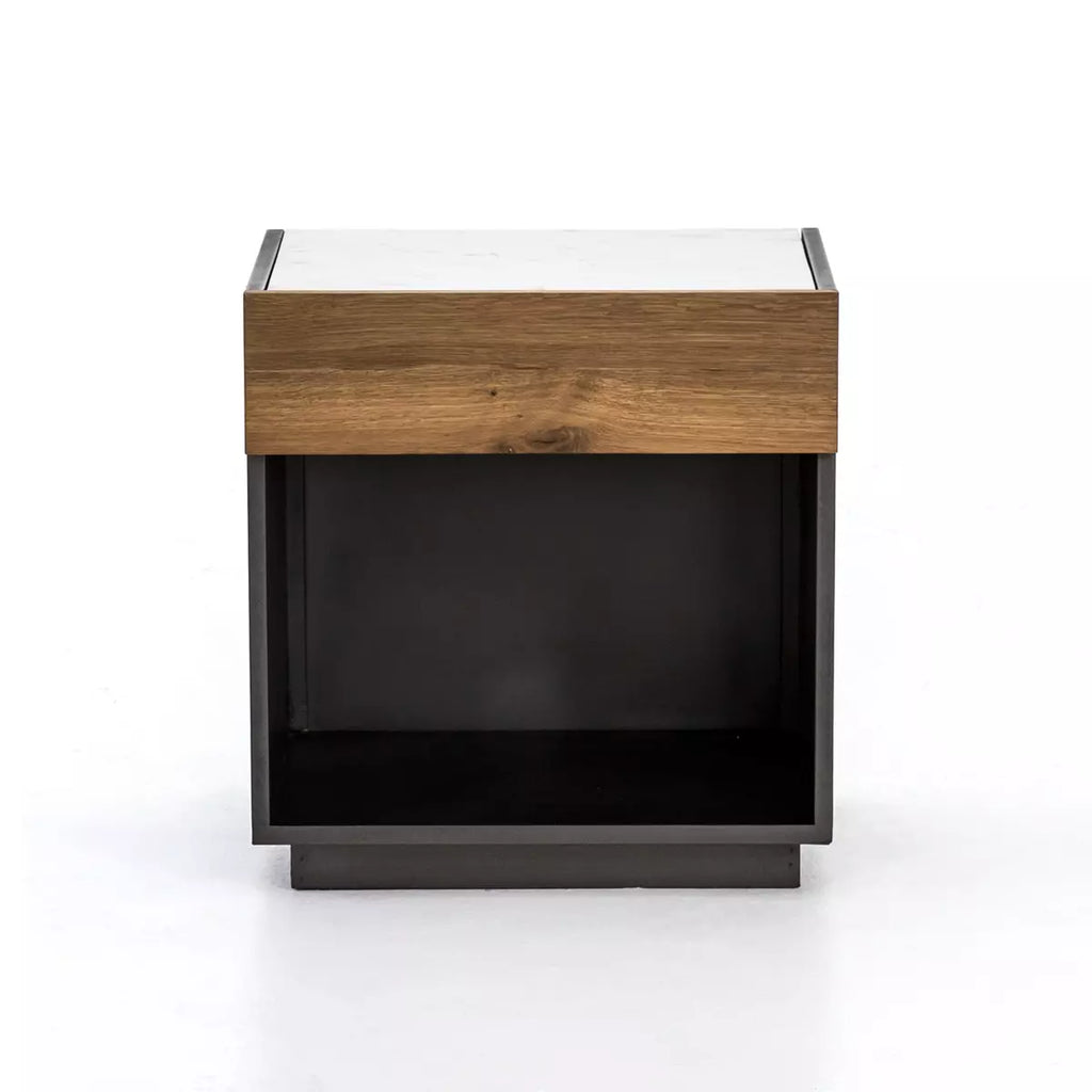 An intriguing material mix, perfectly cubed. Grey-lacquered hardwood casing welcomes a single spacious drawer of smoked oak. A smooth top of polished white marble brings sophisticated contrast to bedside storage.