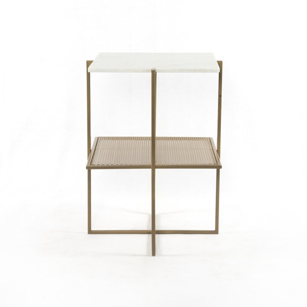 Add a pop of sophistication with a two-tone touch. Slim, antique brass-finished iron forms an X to support tiers of perforated metal and polished white marble for a look of simple grace.