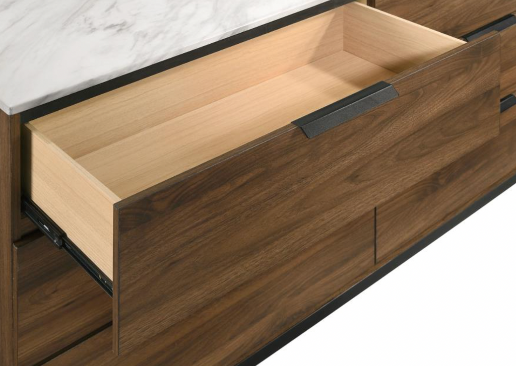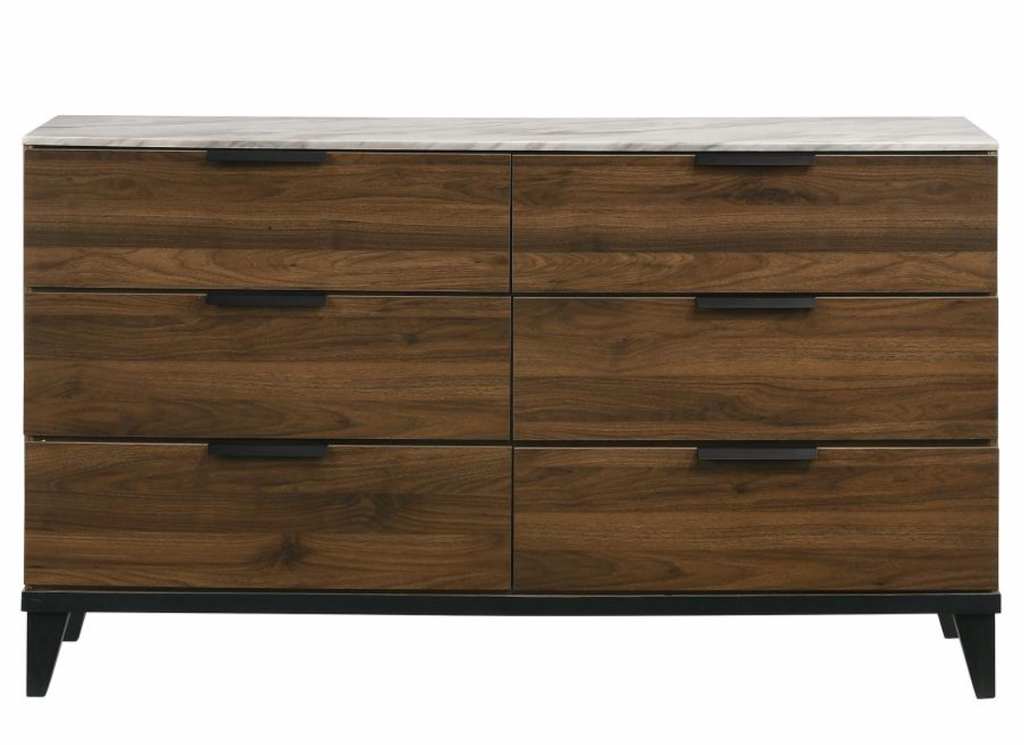 contemporary six-drawer dresser, featuring a long, boxy, walnut finished frame and a striking black base with angled legs. Along each of the six drawers is a slim pull handle that offers a bold contrast against the faux white marble tabletop surface, lending a clean and clutter-free aesthetic for modern bedrooms.