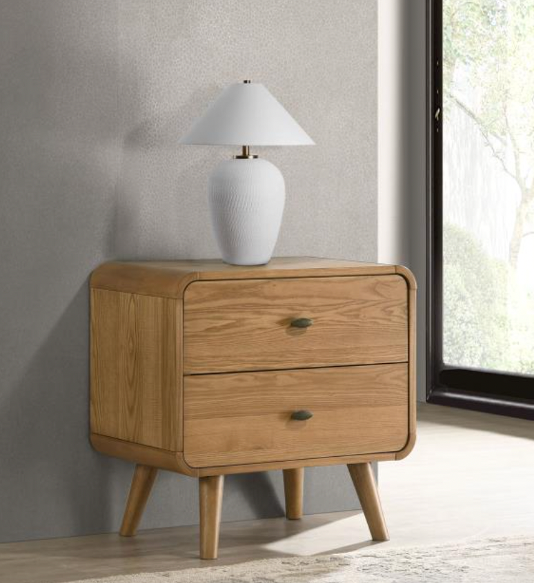 Mid-century modern style with rounded edges, with a light wood finish, and gunmetal hardware. The two-drawer nightstand features a felt-lined top drawer for keeping jewelry safe, and an additional drawer for keeping all your nighttime essentials close at hand.