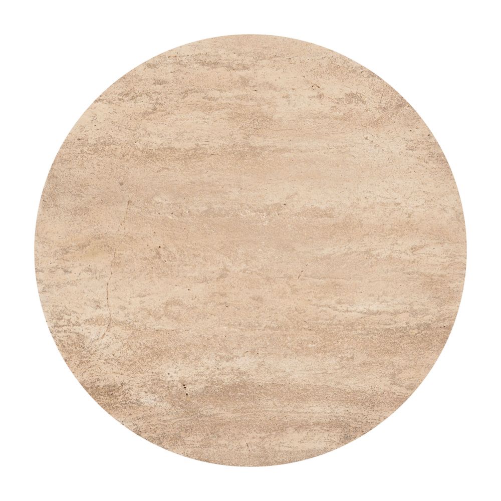 Sandblasted travertine finish provides a warm and inviting texture, while the clean lines and geometric shape create a chic and sophisticated look. The table's solid construction ensures durability, making it a practical and stylish investment for any home or hospitality setting.