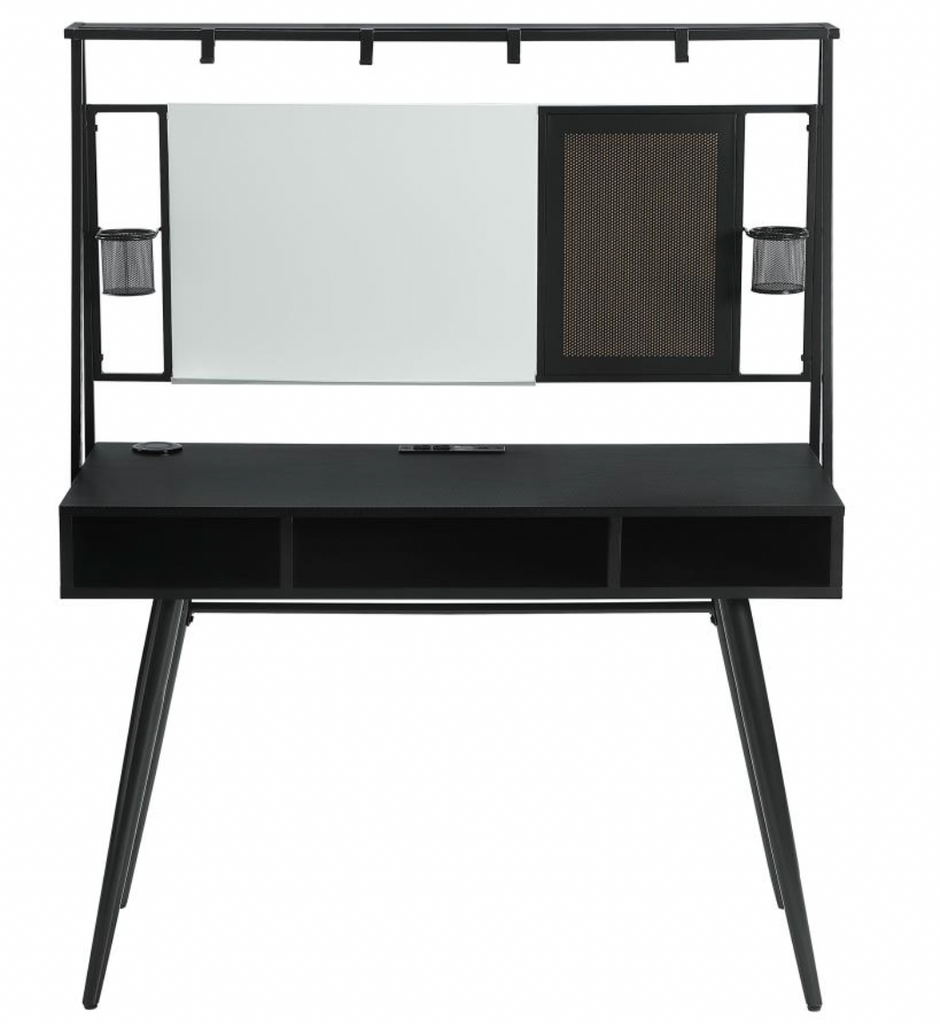 Slender mid-century-inspired metal legs, water and stain-resistant black finish complete with a black finished workspace and gunmetal finished accents. Modern touches like two built-in USB ports, an AC outlet, and a wireless charger allow you to stay connected. Above the desk is a whiteboard setup, cup and water bottle holders, and extra hooks for organizing all your essentials.