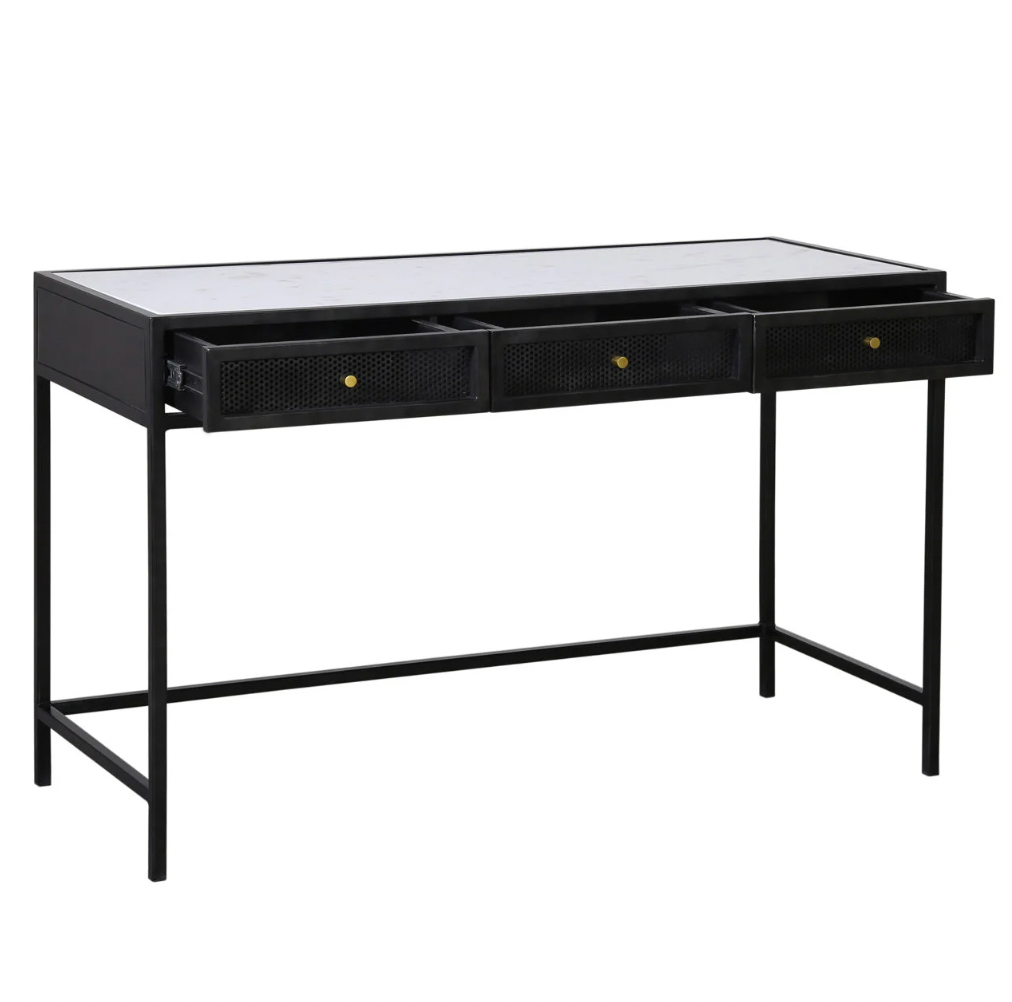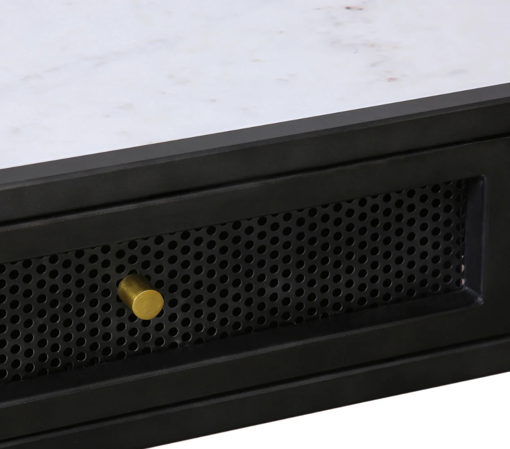 Modern elegance with a graceful silhouette and stunning contrasting materials. Meticulously crafted with high-quality iron, finished using a black antique colorway and banswara natural white marble top. It is completed with three mesh iron drawer fronts accented with gold hardware knobs for easy opening.