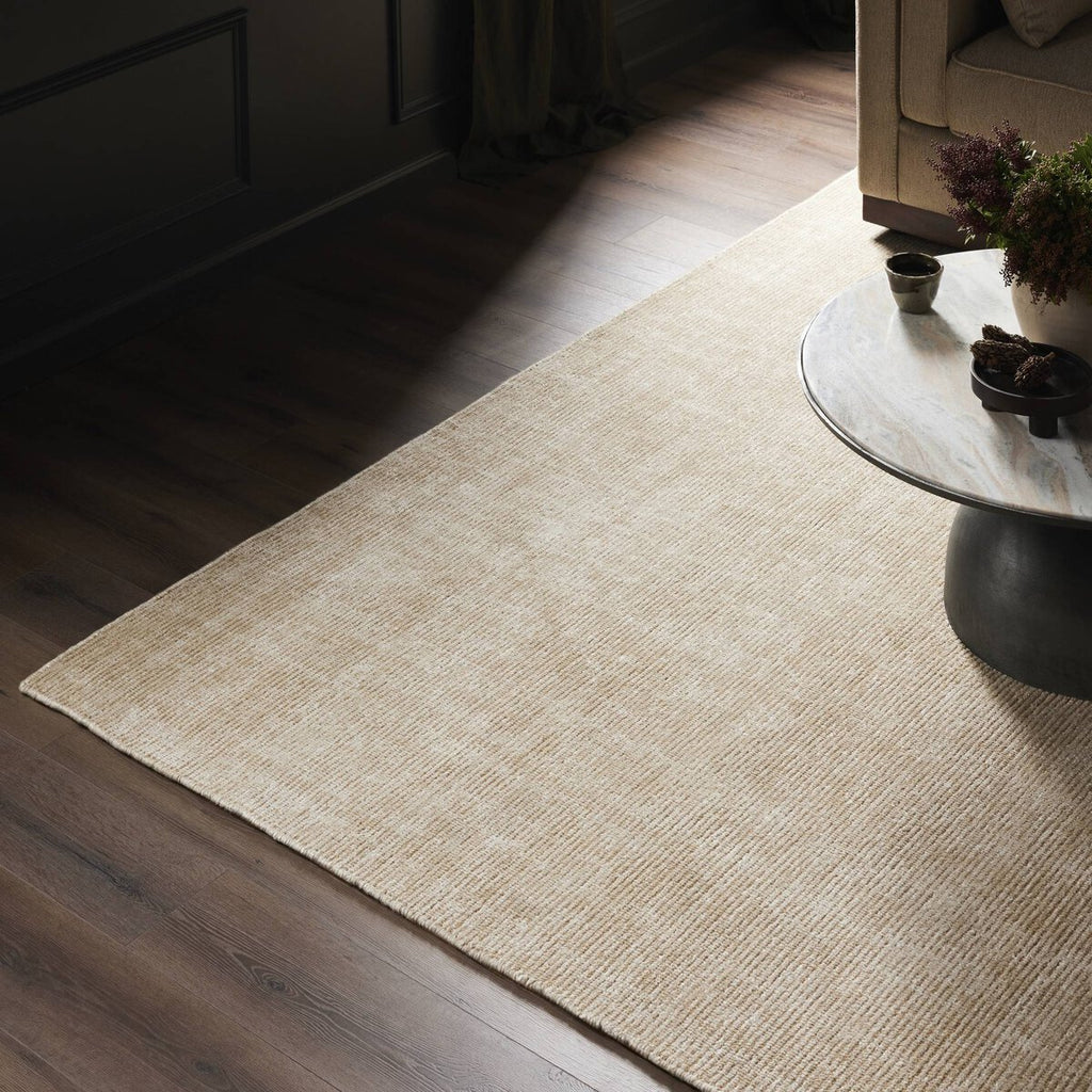A solid cream area rug with jute woven throughout for a touch of texture and natural material.