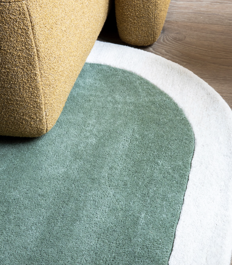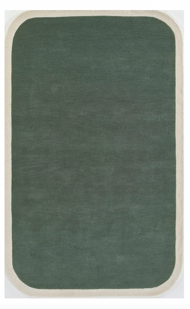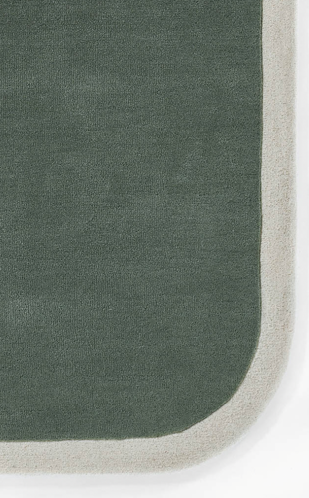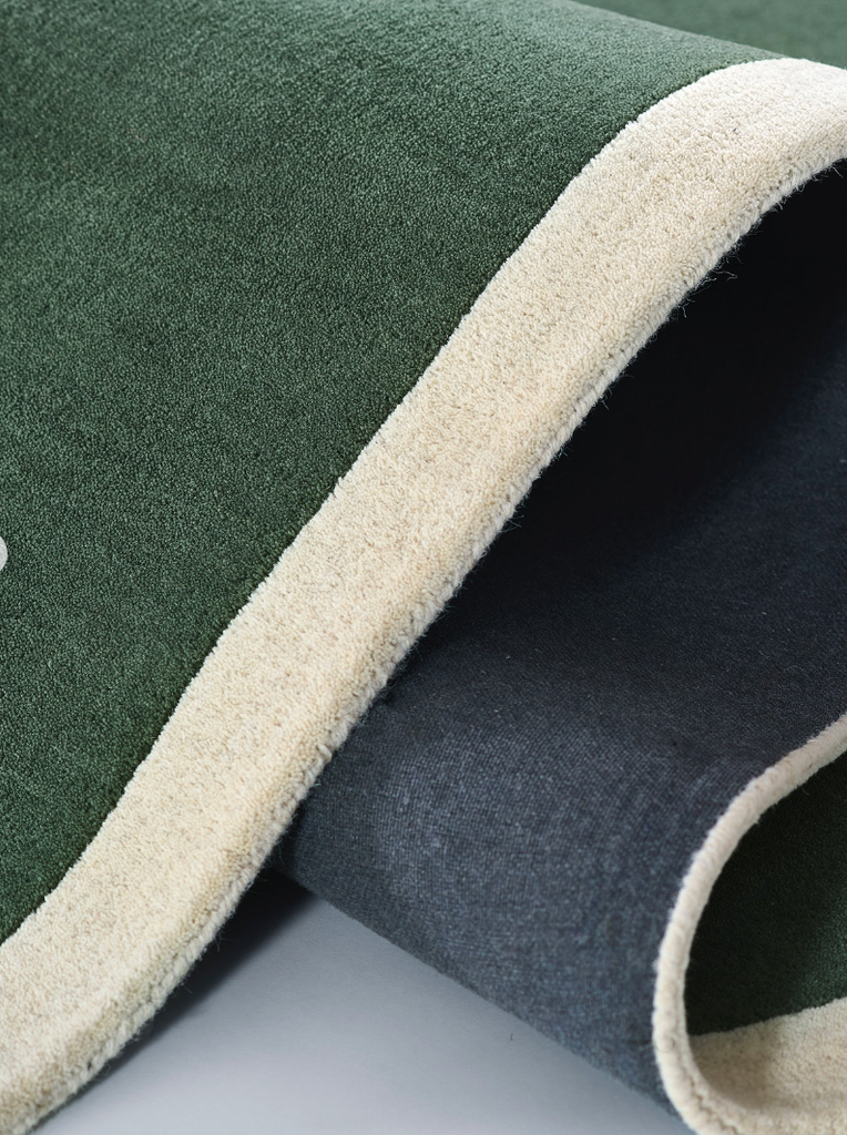 A hand-tufted rug in rich shades of jade, embodying the vibrant spirit of the 70's, with elegant ivory edging for a timeless touch..