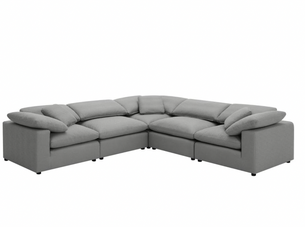 Center your relaxed living space on a modern five-piece sectional sofa, taking a laid-back approach to seating. This sofa, upholstered in tailored water-resistant boucle performance fabric with topstitch details, offers a refined, contemporary style in a neutral hue, perfect for any inviting living room.  Plush foam cushions and a feather blend.