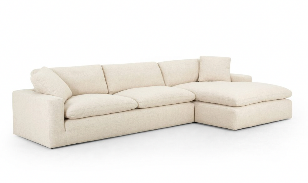 Two-piece, right arm facing sectional is oversized and billowy for ultimate comfort, with block arms squaring off sink-in seating and ample feather-and-down cushioning. Performance fabrics are specially created to withstand spills, stains, high traffic and wear, ensuring long-term comfort and unmatched durability.