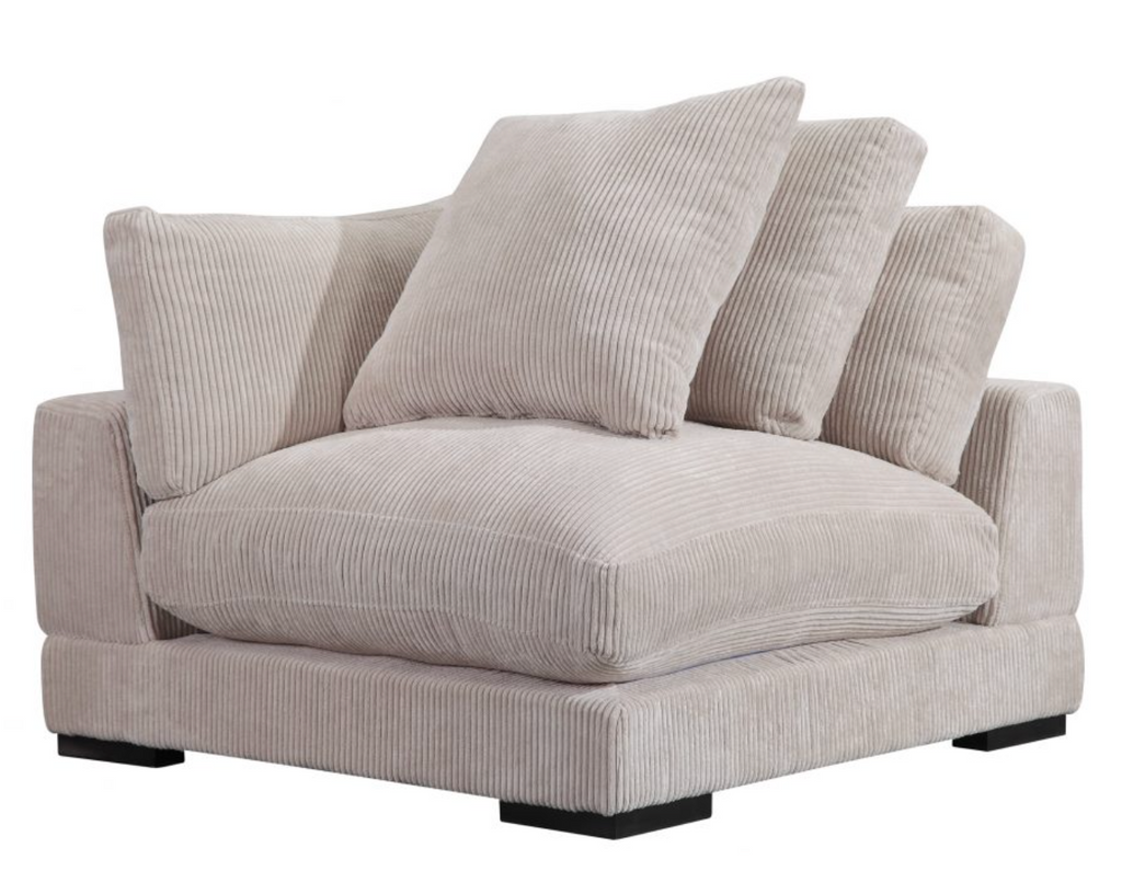 Seriously comfortable, seriously stylish. Framed in solid eucalyptus wood with extra, fully down-filled, removable back cushions. This sectional's soft corduroy will immediately add dimension, intrigue, lift, and comfort to any environment.
