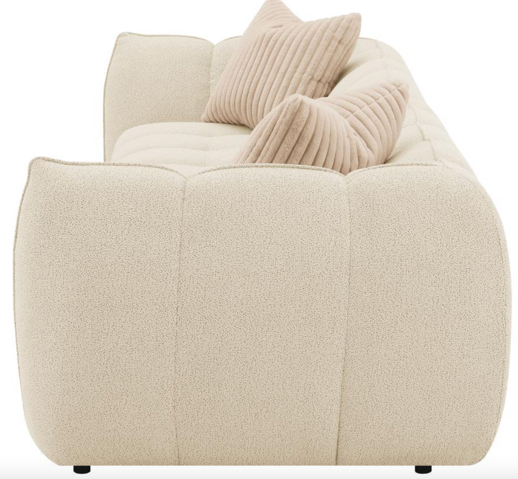 Cuddle up in stylish comfort with this modern extra-long sofa, a perfect interior focal point with its fun bubble-like design. The sofa shows off boucle upholstery in a sand pebble hue, adding an inviting warmth to your décor. It's incredibly comfortable and spacious, featuring wrap-around extra plush channeling with tufted accents on a waterfall bench seat, ideal for large living rooms and lounging or entertaining.