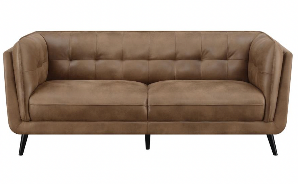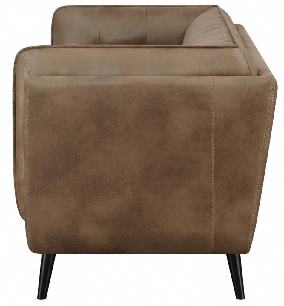 Elevate your mid-century modern living room seating area with this contemporary Chesterfield shelter style sofa, upholstered in a soft and smooth brown microfiber leather throughout its welt-trimmed and grid tufted seats and cushions.