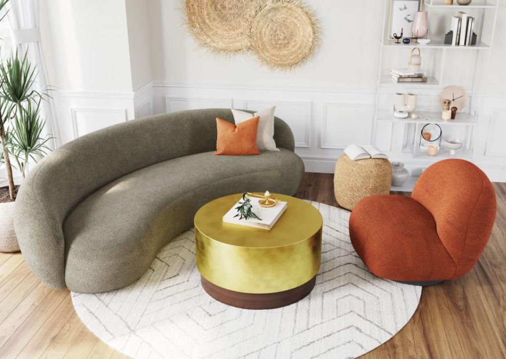 This sofa has a polyester shearling style fabric that works great in any space, the shape and design are glam, modern, deco, and boho all at the same time.
