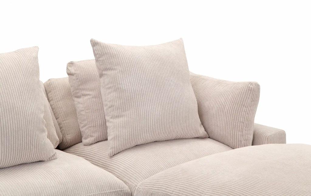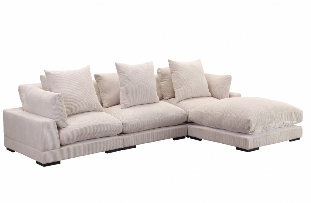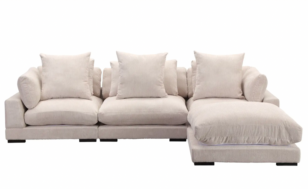 Tumble's corduroy naturally softens the sharp edges and hard lines of other accents like coffee and end tables with its inherent plushness. Framed in solid eucalyptus wood with extra, fully down-filled, removable back cushions, the Tumble Dream is modular perfection. This sectional’s soft corduroy will immediately add dimension, intrigue, lift, and comfort to any environment.