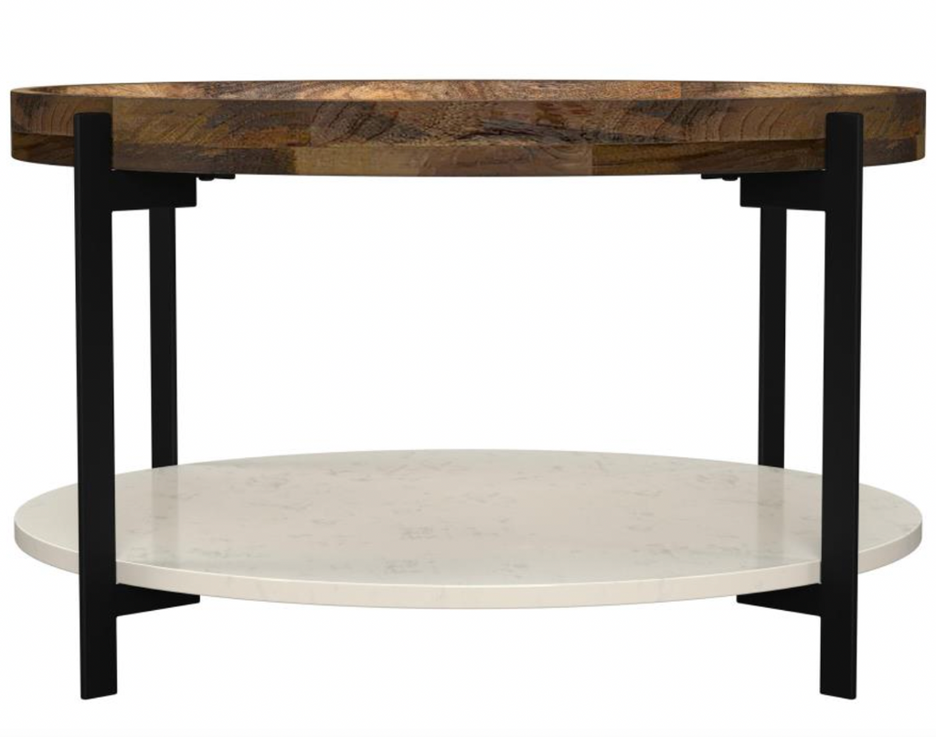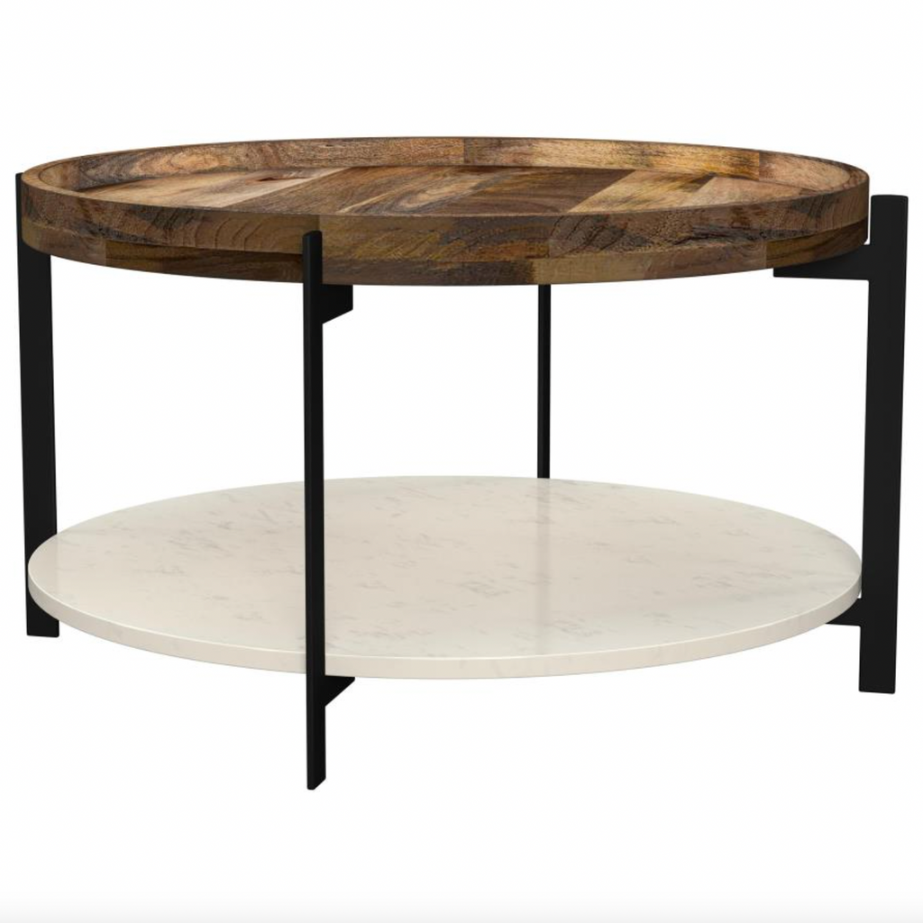 Organic materials and modern design. Round coffee table crafted from mango wood, marble, and iron.