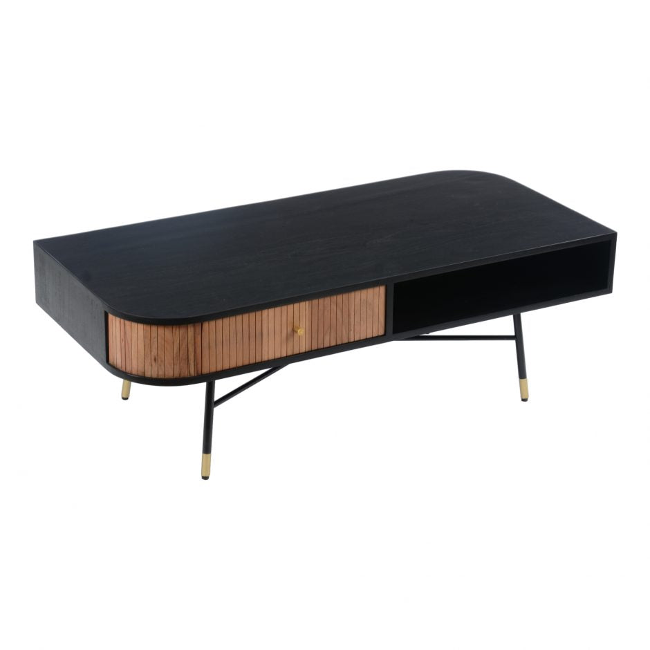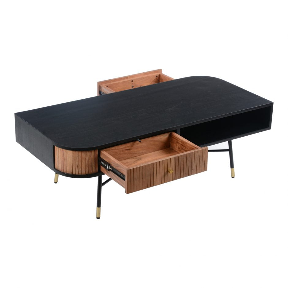 A wood and iron affair. The Black and Tan coffee table adds character to your home with its curved sides, opposite drawers, and pinstriped detailing. Natural wood grain and knots give its iron frame and brass detailing a down-to-earth feel.