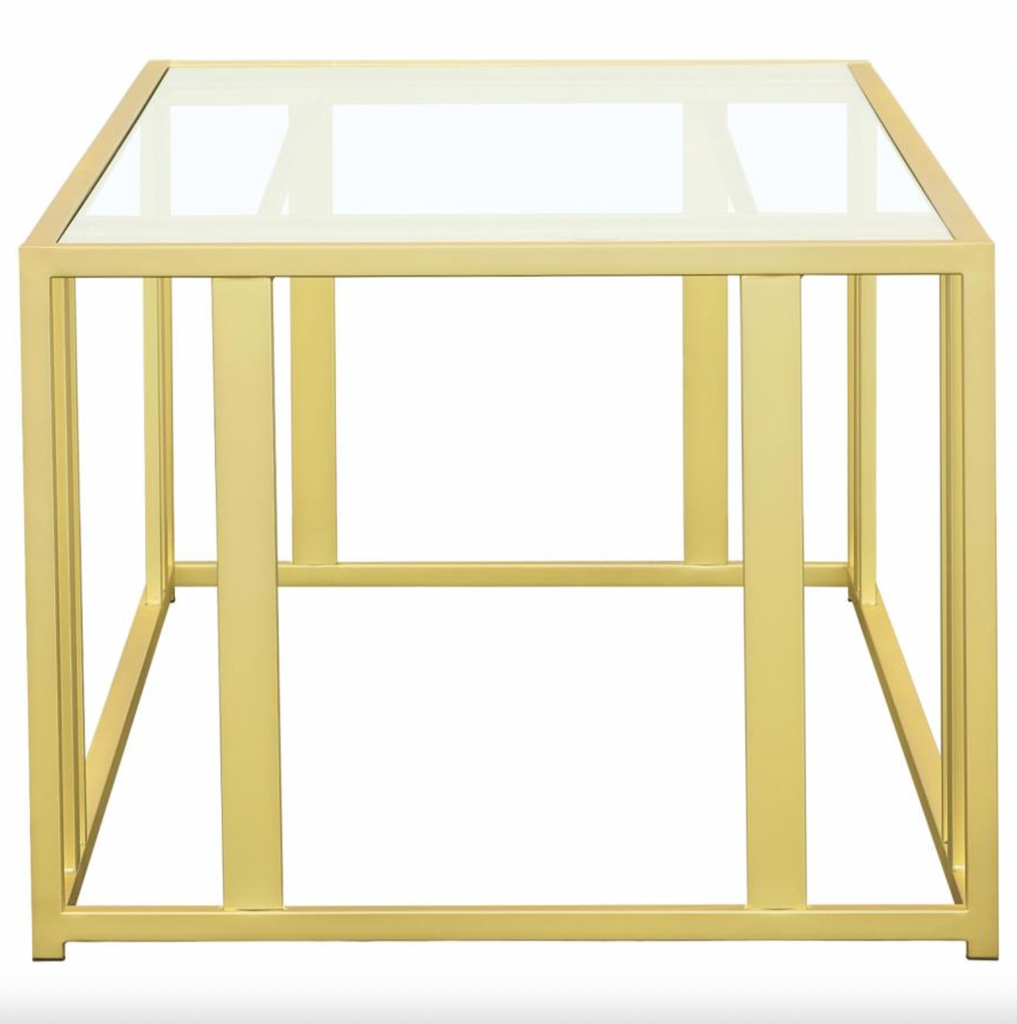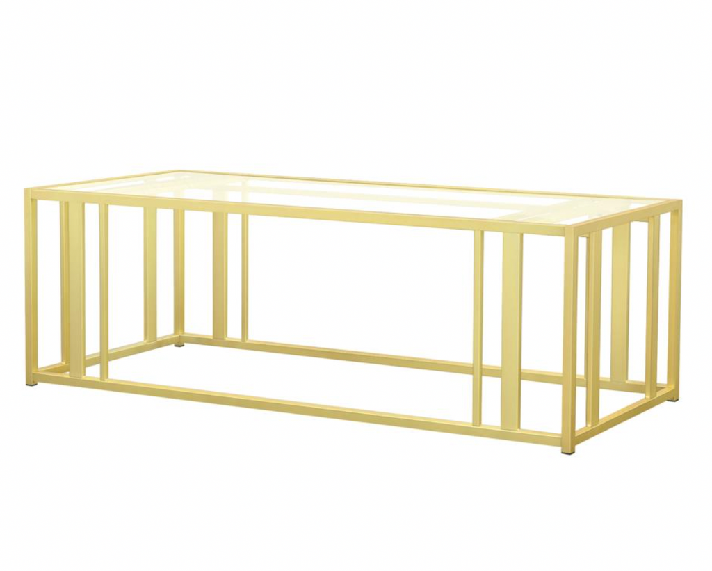 This modern rectangular coffee table features a clear tempered glass top paired with a geometric base made from heavy-gauge metal with a sleek electroplated finish.