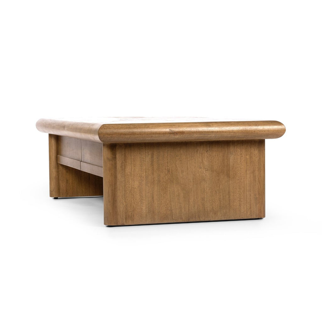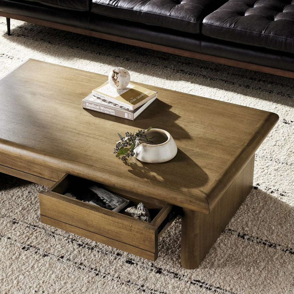 Made from weathered parawood with thick proportions, a rectangular coffee table features four drawers, brining bonus storage space to your living room.
