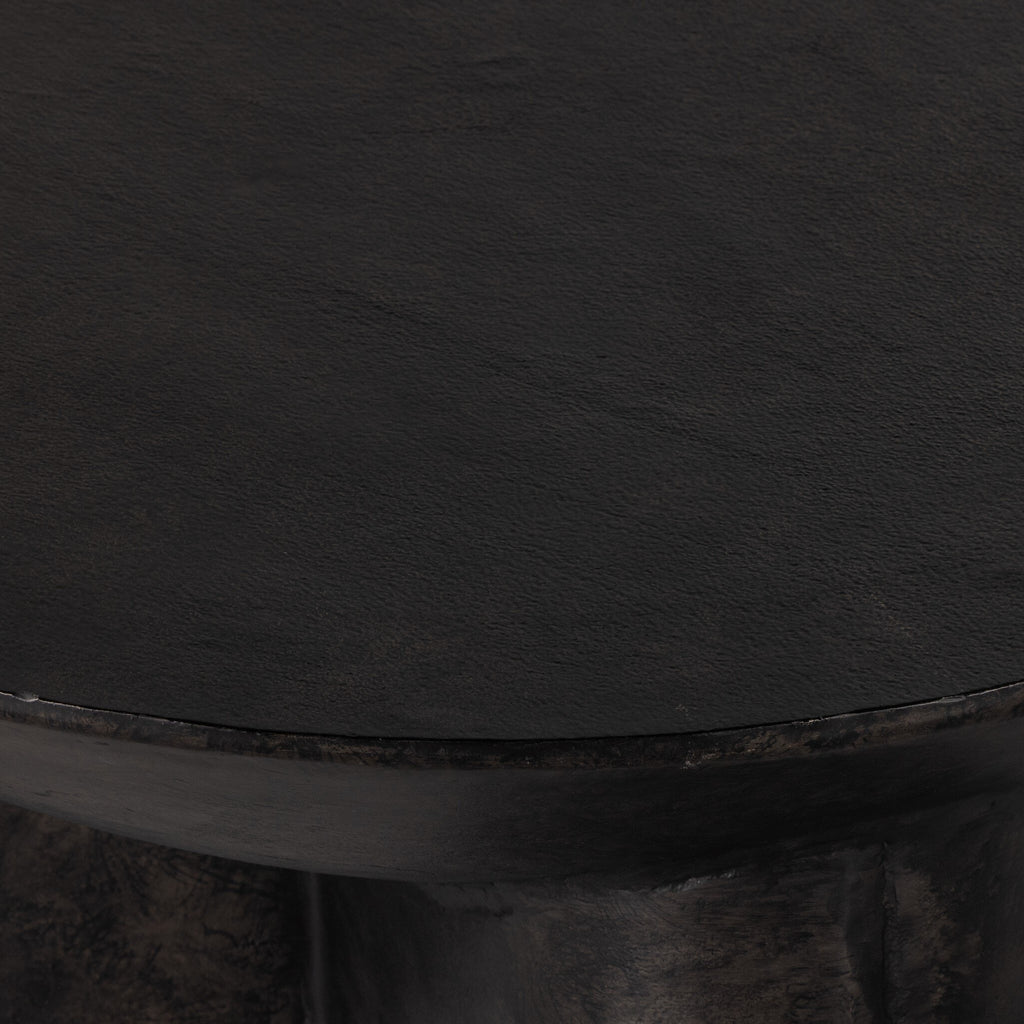 Made from cast aluminum with a raw black finish, a soft, voluminous Y base supports a drum-style tabletop with natural highs and lows.