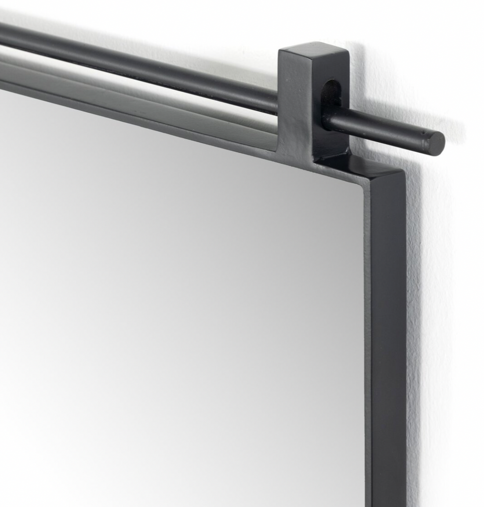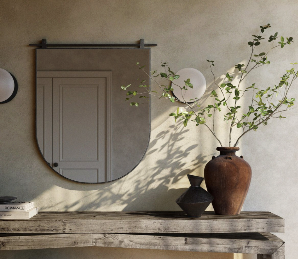 A slim antique iron bar suspends a simple arch for a streamlined, modern-minimalist look. Damp rated and designed to withstand moisture indoors, including bathrooms.