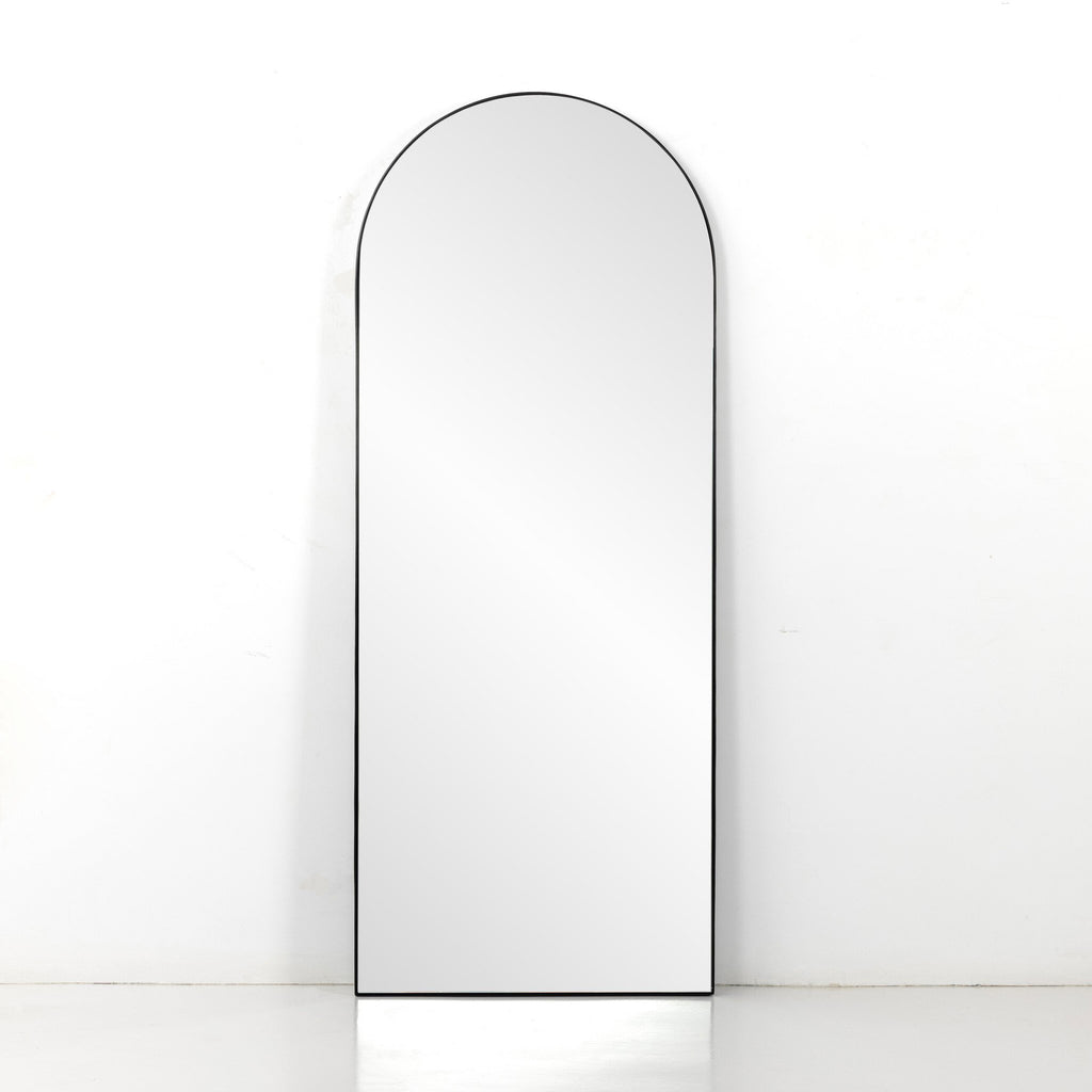 A beautifully arched mirror in an iron frame with a matte black finish.