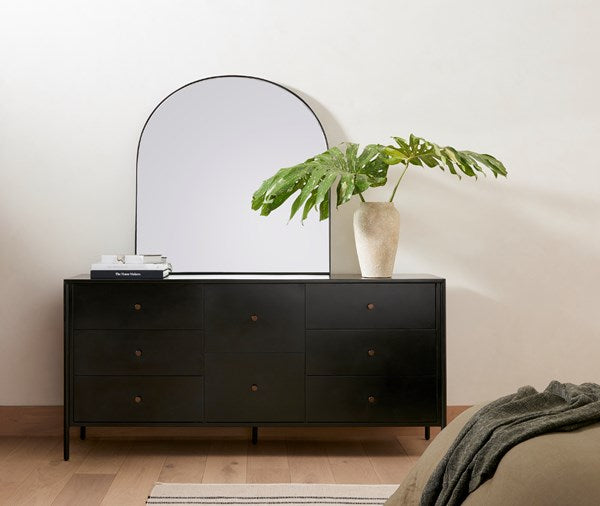 Perfectly scaled for styling above a mantel or fireplace, a beautifully arched mirror is finished out in a chic matte black.