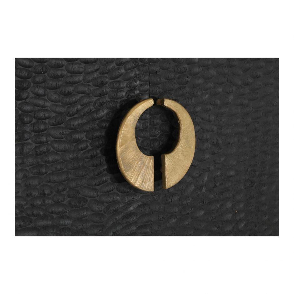 Keep your favorite drinks stored in style with the Hope bar cabinet. The sleek black finish, striking indented pattern and elegant brass detailing create a unique yet contemporary aesthetic. Open the doors and you'll find ample bottle racks to store your wine and liquor.