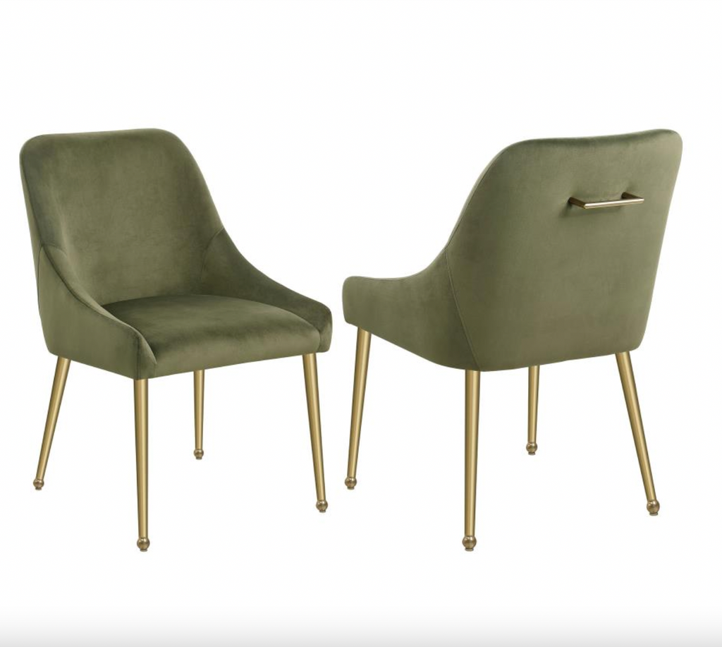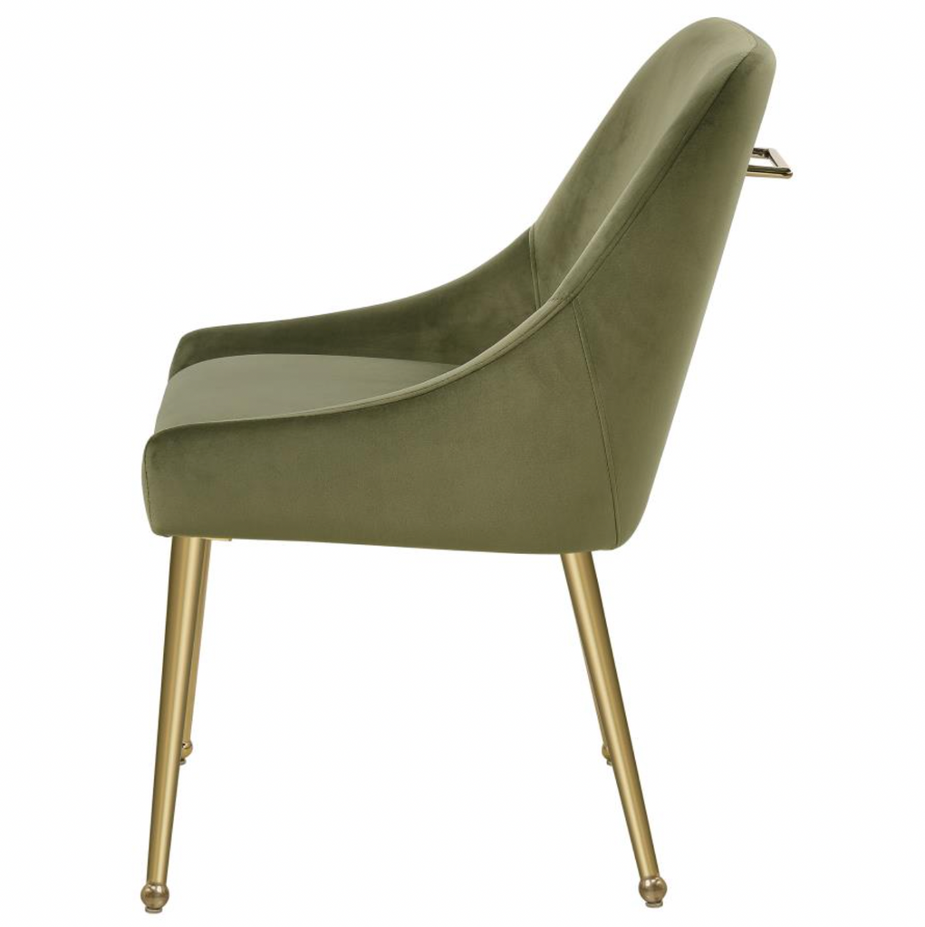 Italian style dining side chairs upholstered in olive green velvet with gold accent.
